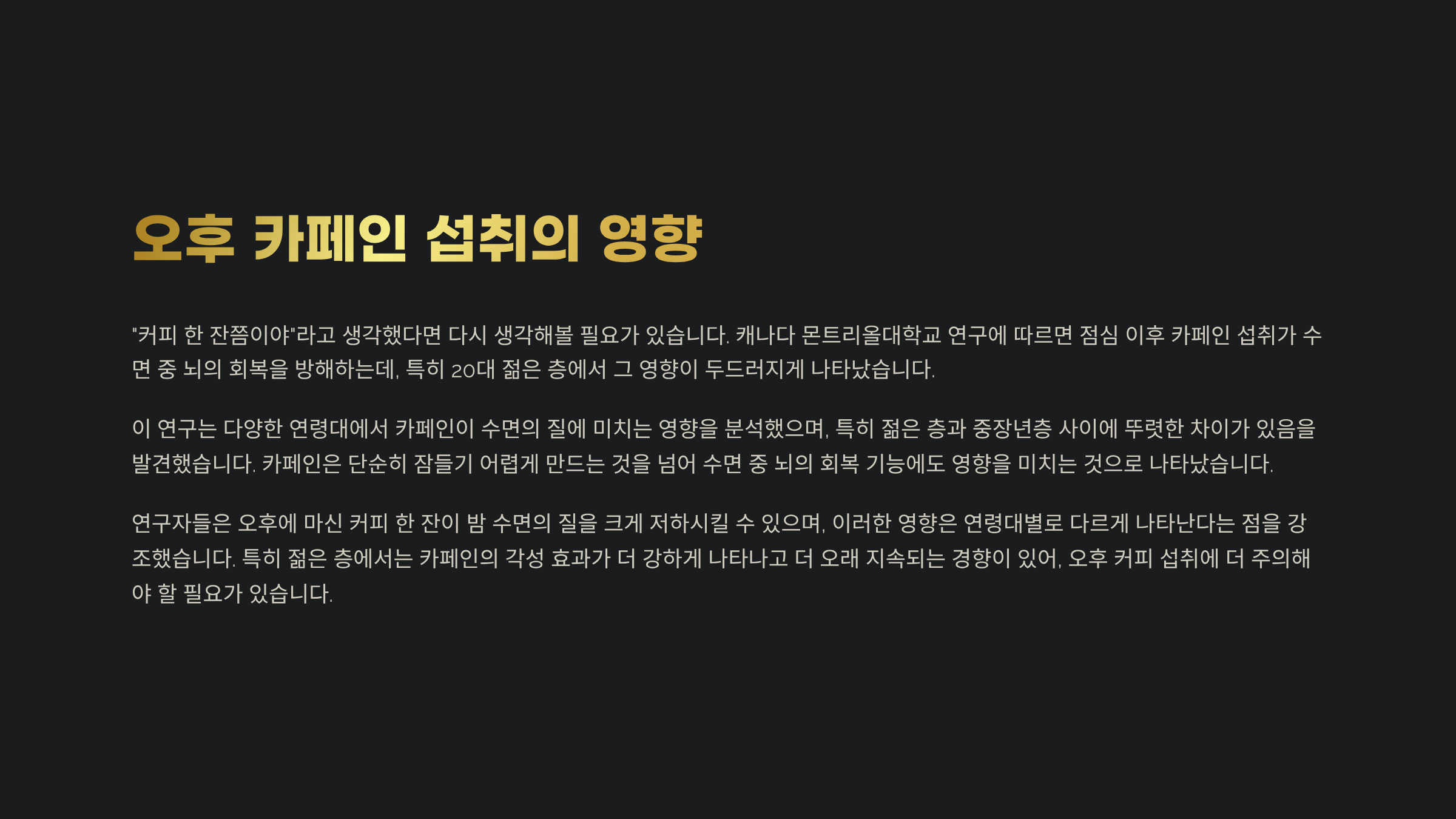 “커피 한 잔쯤이야”라고 생각했다면 다시 생각해볼 필요가 있습니다. 캐나다 몬트리올대학교 연구에 따르면 점심 이후 카페인 섭취가 수면 중 뇌의 회복을 방해하는데, 특히 20대 젊은 층에서 그 영향이 두드러지게 나타났습니다. 이 글에서는 연령대별 카페인 대사 차이와 수면 질에 미치는 영향을 최신 연구 데이터로 분석합니다.