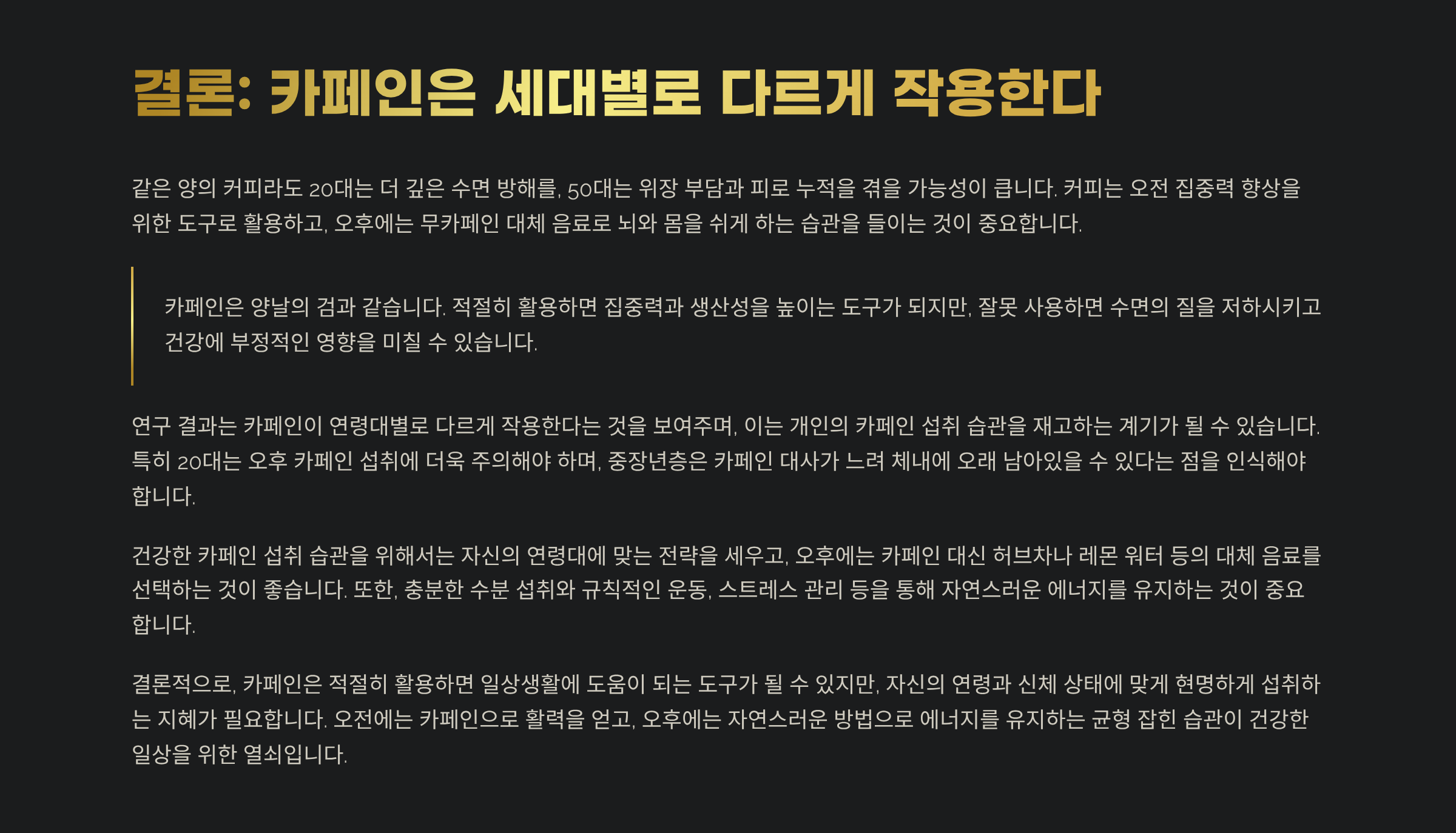 같은 양의 커피라도 20대는 더 깊은 수면 방해를, 50대는 위장 부담과 피로 누적을 겪을 가능성이 큽니다. 커피는 오전 집중력 향상을 위한 도구로 활용하고, 오후에는 무카페인 대체 음료로 뇌와 몸을 쉬게 하는 습관을 들이는 것이 중요합니다.