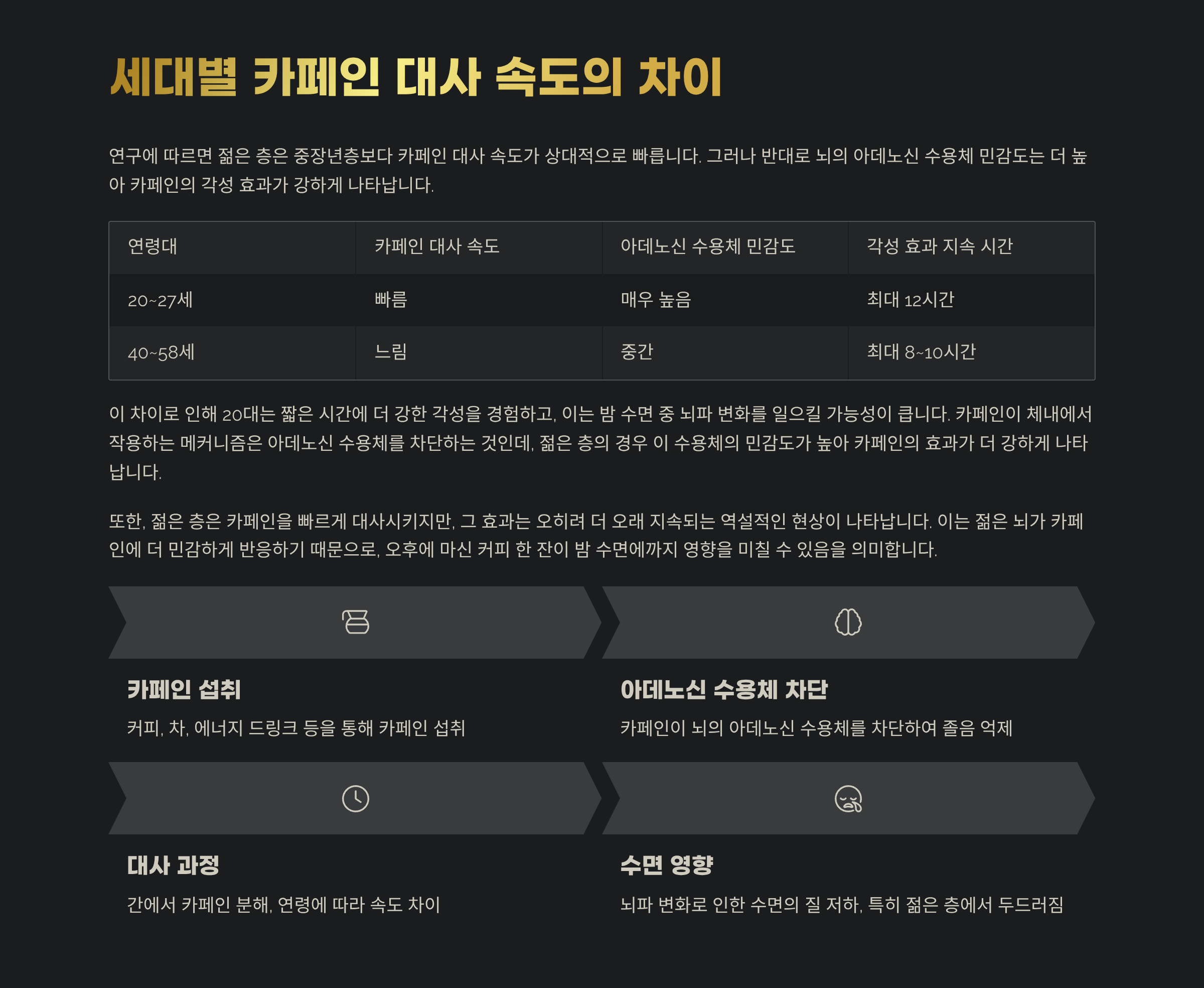 연령대 카페인 대사 속도 아데노신 수용체 민감도 각성 효과 지속 시간