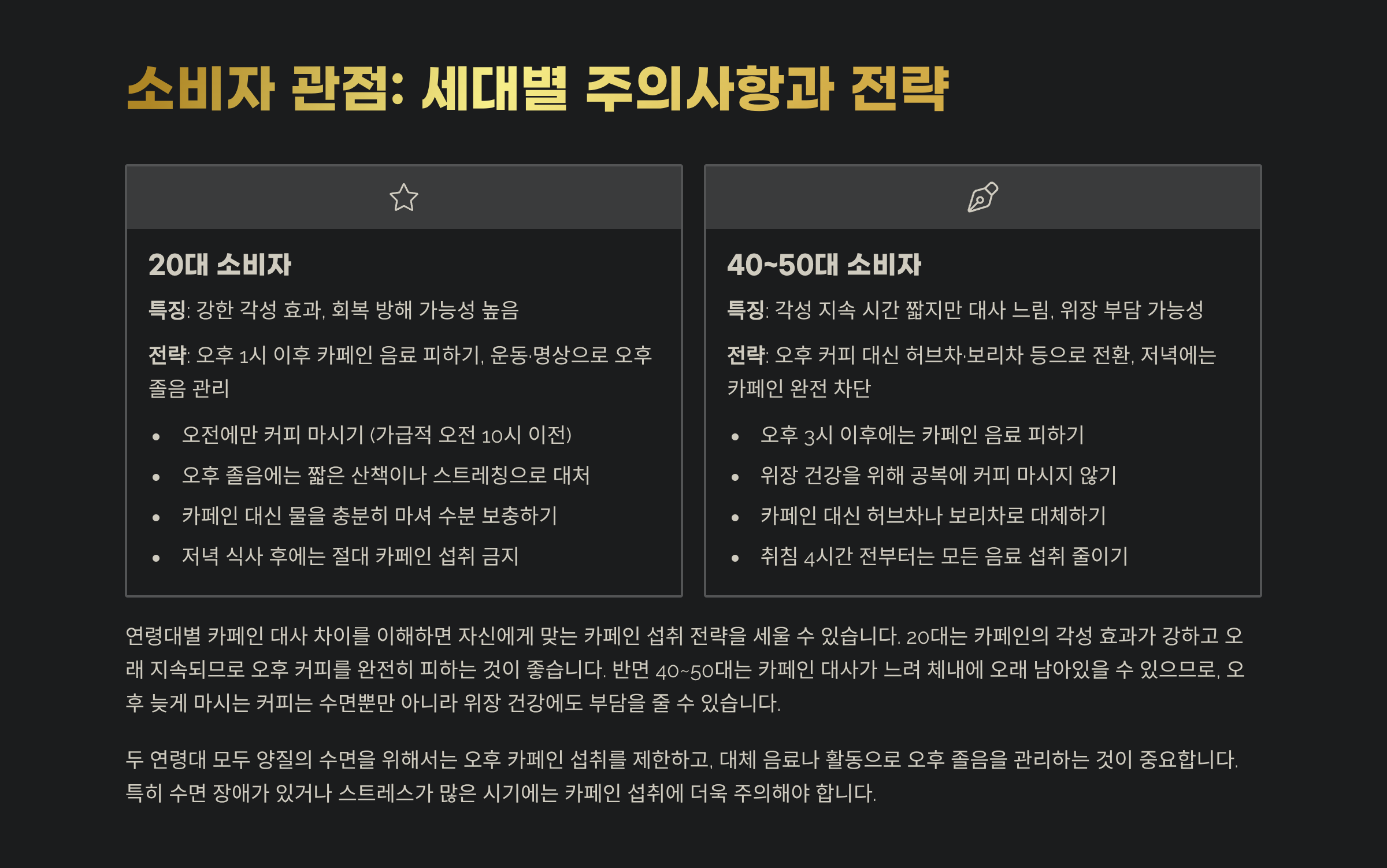 - 전략: 오후 커피 대신 허브차·보리차 등으로 전환, 저녁에는 카페인 완전 차단