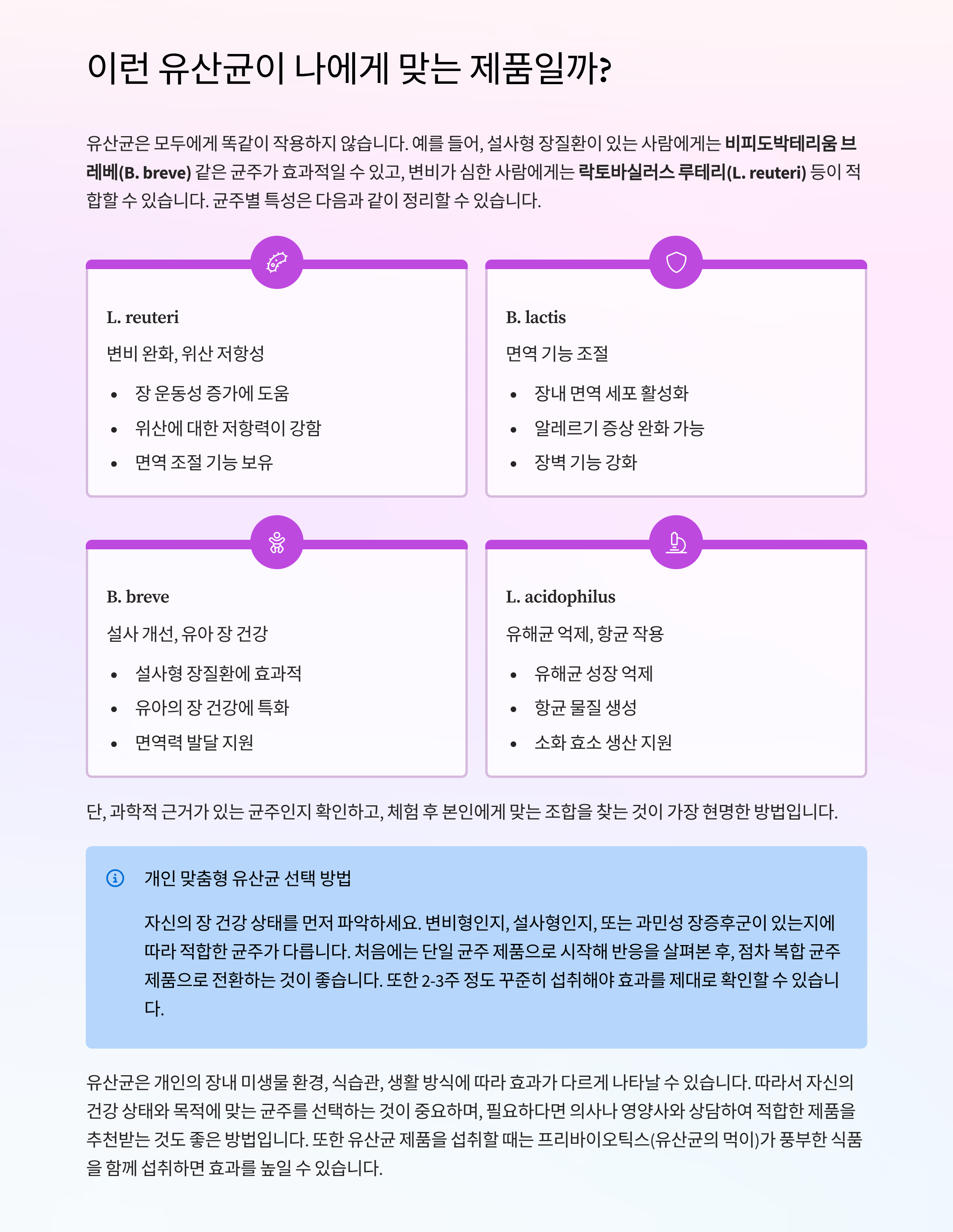 예를 들어, 설사형 장질환이 있는 사람에게는 비피도박테리움 브레베(B. breve) 같은 균주가 효과적일 수 있고, 변비가 심한 사람에게는 락토바실러스 루테리(L. reuteri) 등이 적합할 수 있습니다.