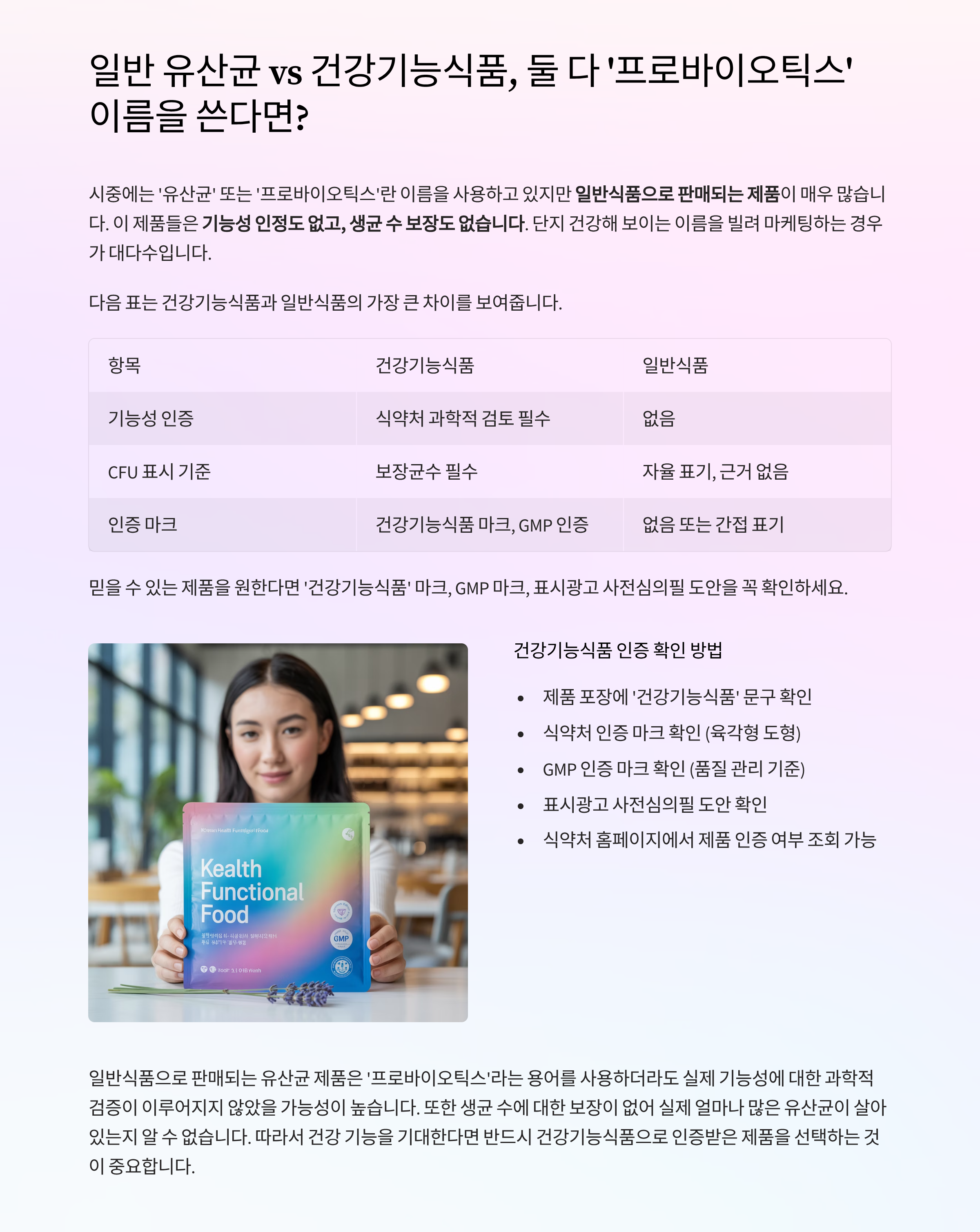 | CFU 표시 기준 | 보장균수 필수 | 자율 표기, 근거 없음 |