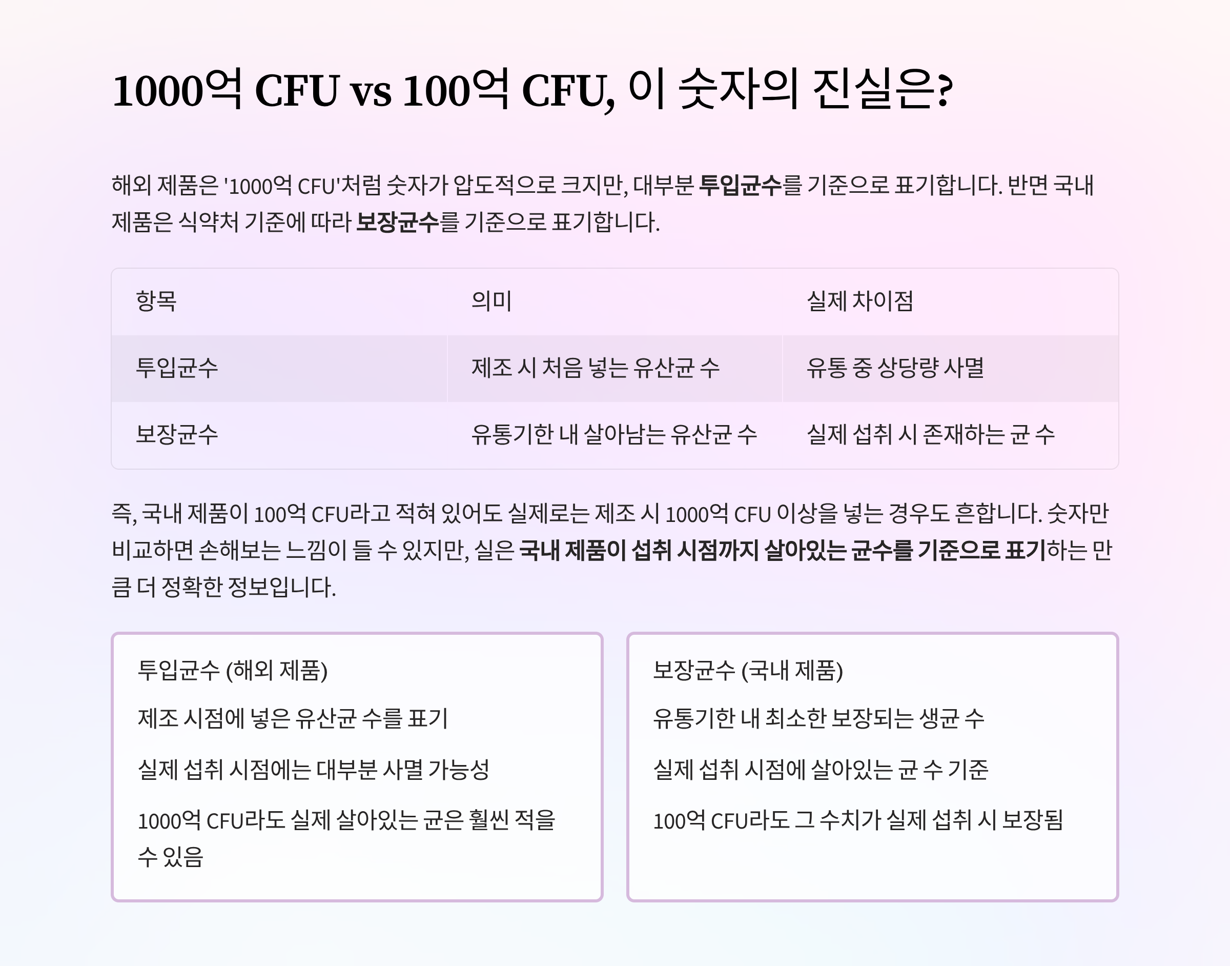 해외 제품은 '1000억 CFU'처럼 숫자가 압도적으로 크지만, 대부분 투입균수를 기준으로 표기합니다. 반면 국내 제품은 식약처 기준에 따라 보장균수를 기준으로 표기합니다.