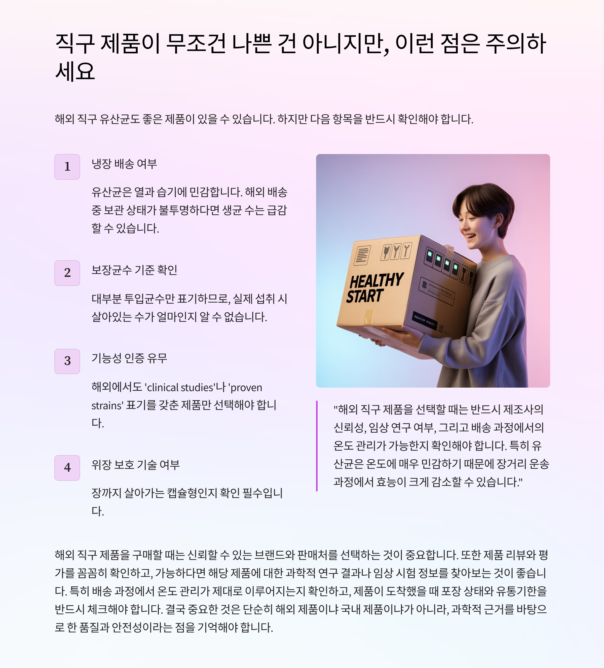 - 냉장 배송 여부: 유산균은 열과 습기에 민감합니다. 해외 배송 중 보관 상태가 불투명하다면 생균 수는 급감할 수 있습니다.