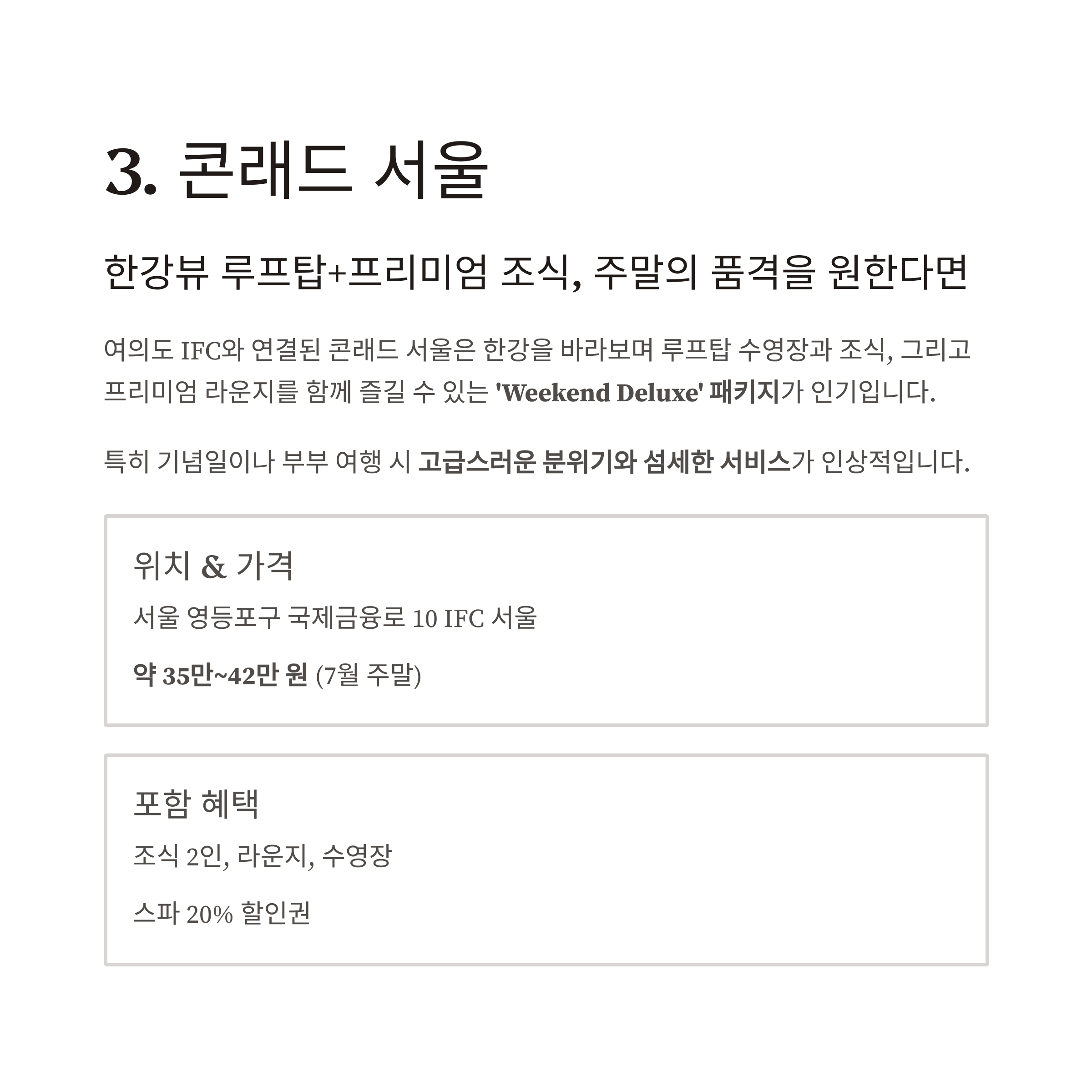 | 콘래드 서울 | 서울 | 35만~42만 원 | 조식, 라운지, 한강뷰 업그레이드 | 기념일·프리미엄 여행자 |