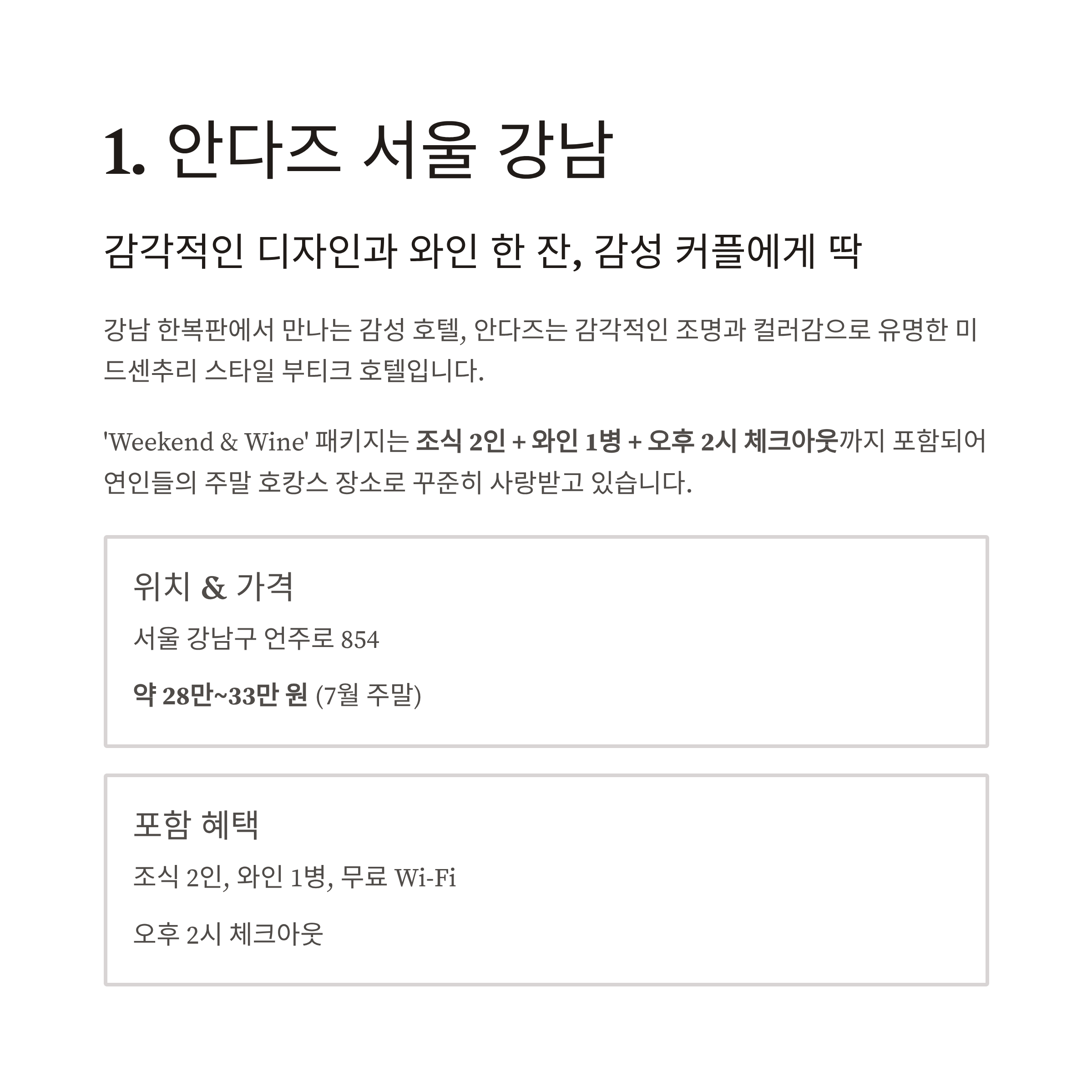 | 안다즈 서울 | 서울 | 28만~33만 원 | 조식, 와인, 오후 2시 체크아웃 | 감성 커플 여행자 |