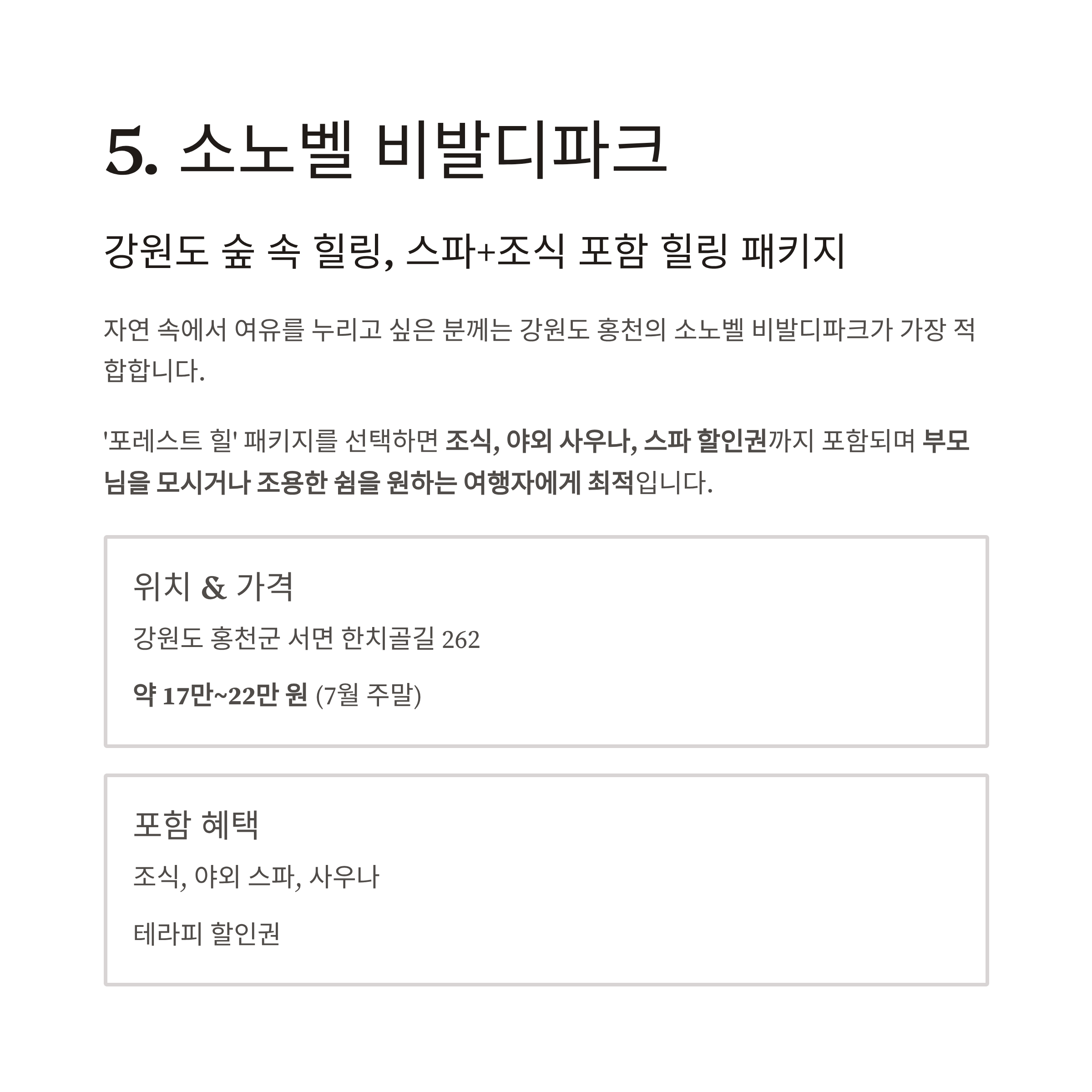 | 소노벨 비발디파크 | 강원 | 17만~22만 원 | 조식, 사우나, 숲속 힐링 | 부모님·조용한 여행자 |