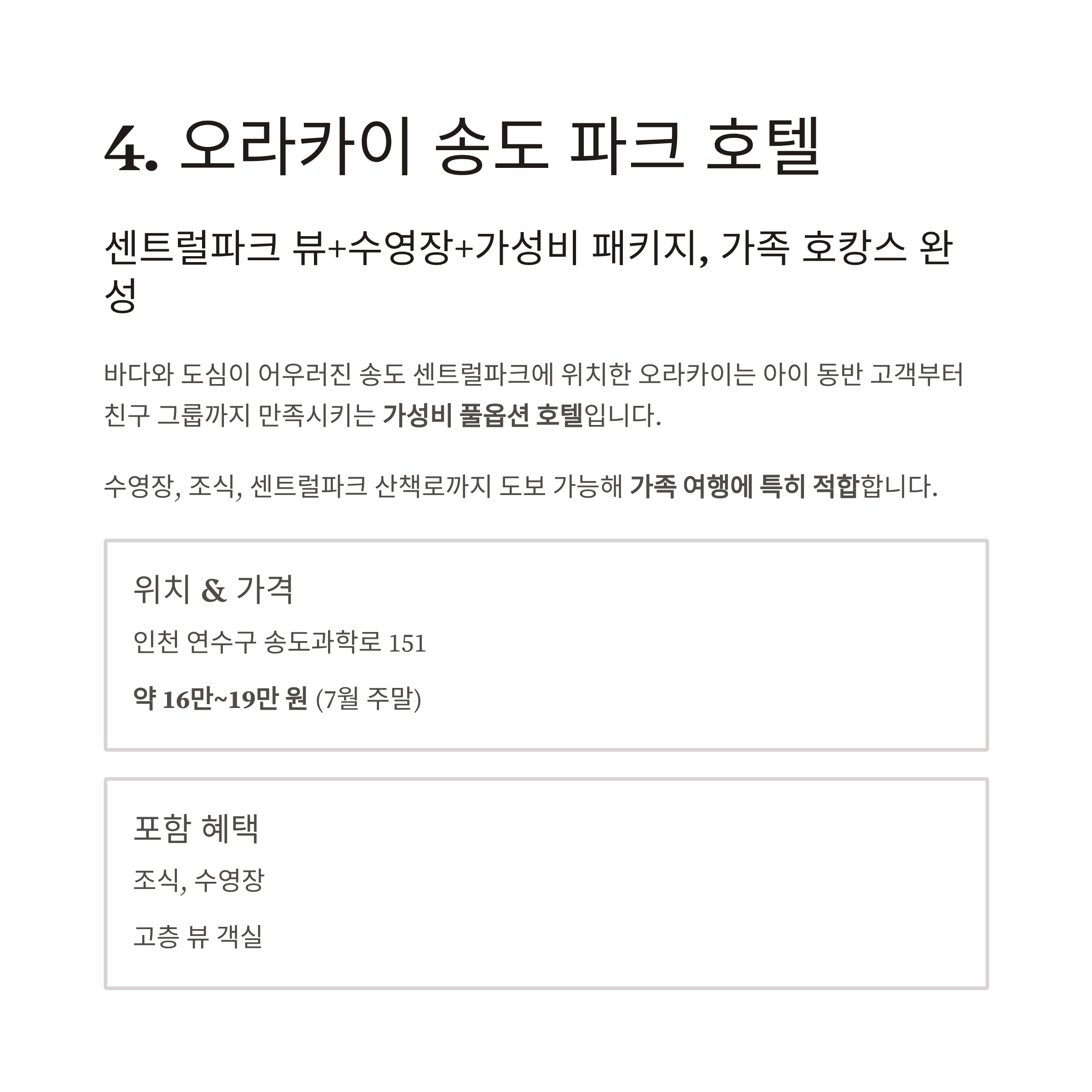 | 오라카이 송도 | 인천 | 16만~19만 원 | 조식, 수영장, 고층 뷰 | 가족·어린이 동반 |