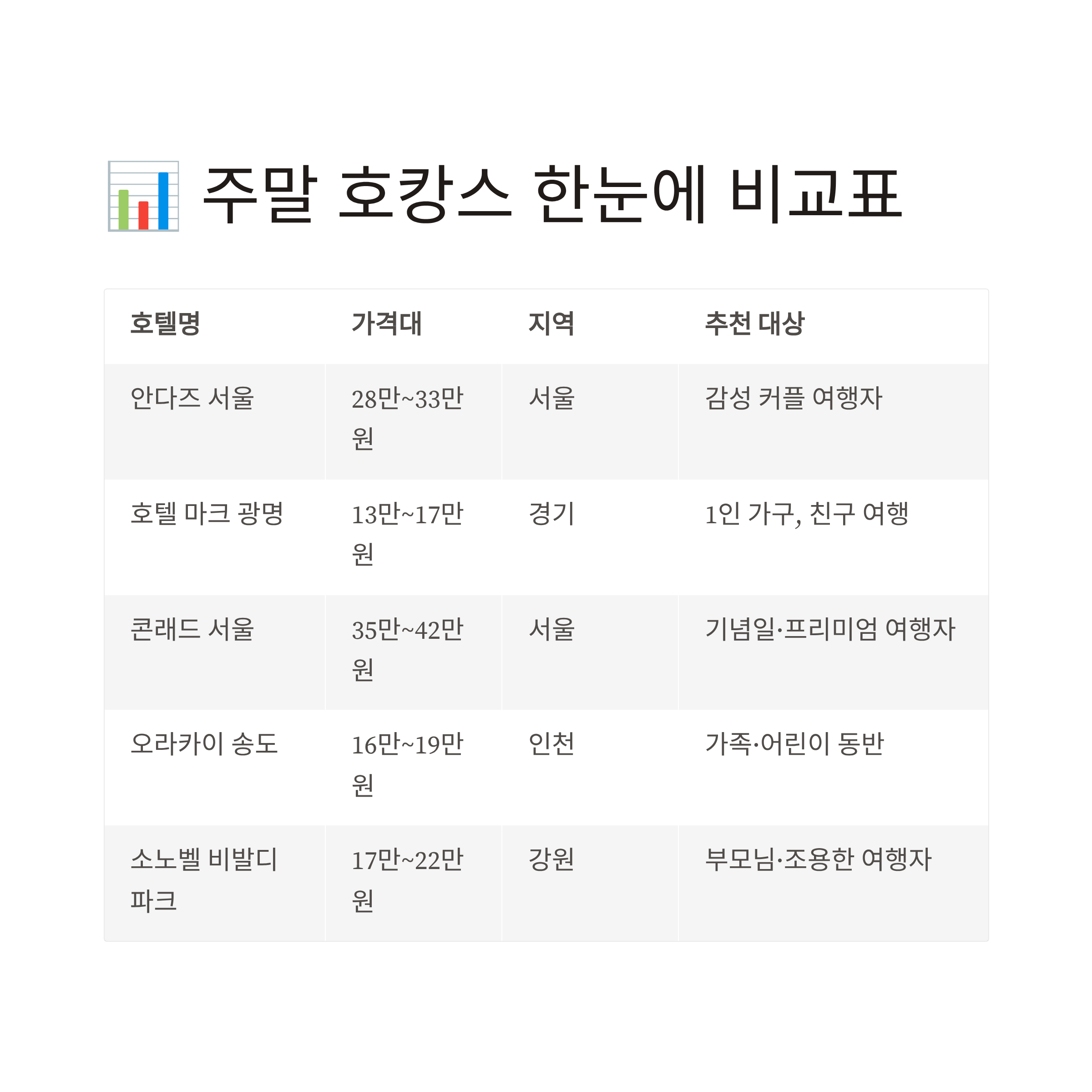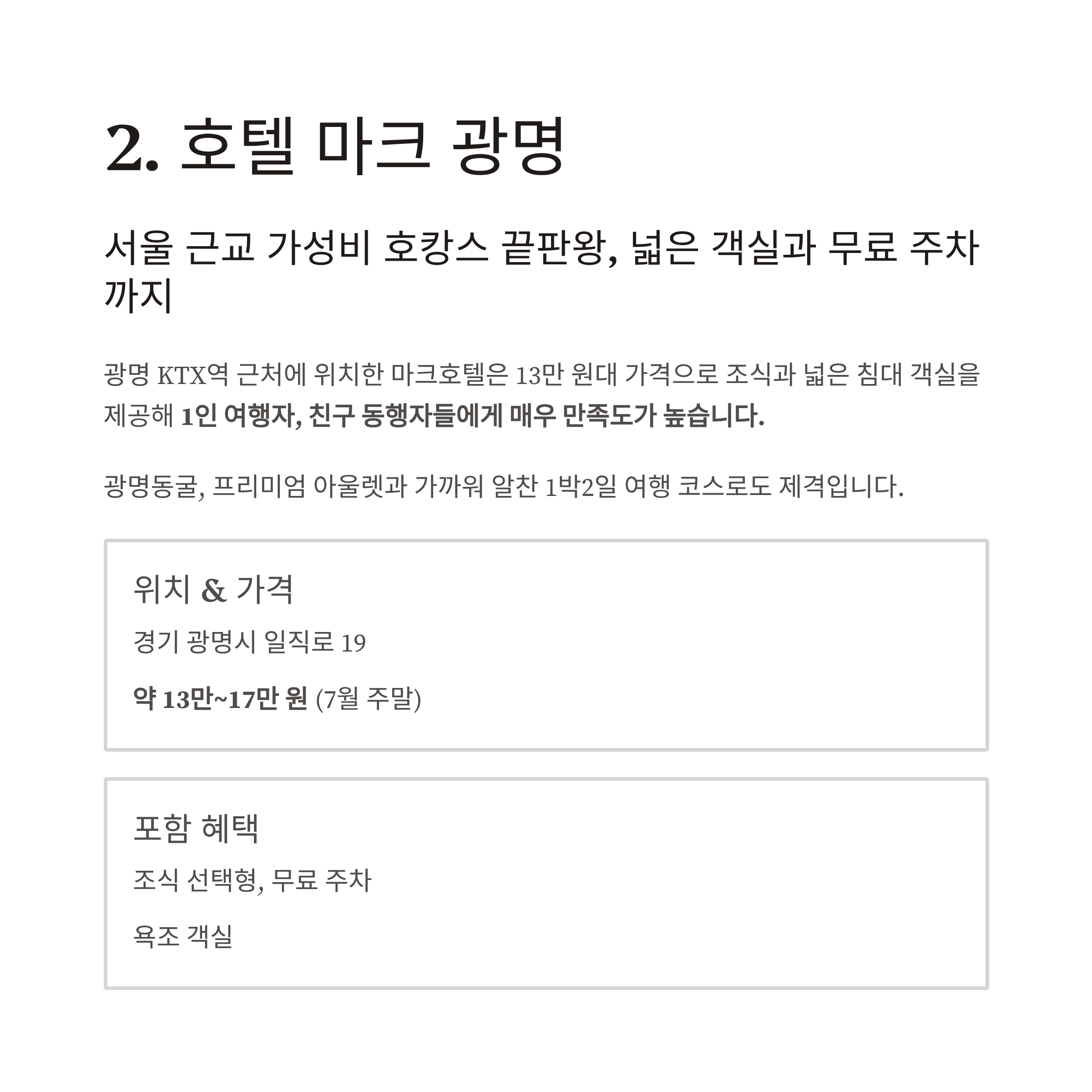 | 호텔 마크 광명 | 경기 | 13만~17만 원 | 조식 선택, 무료 주차 | 1인 가구, 친구 여행 |