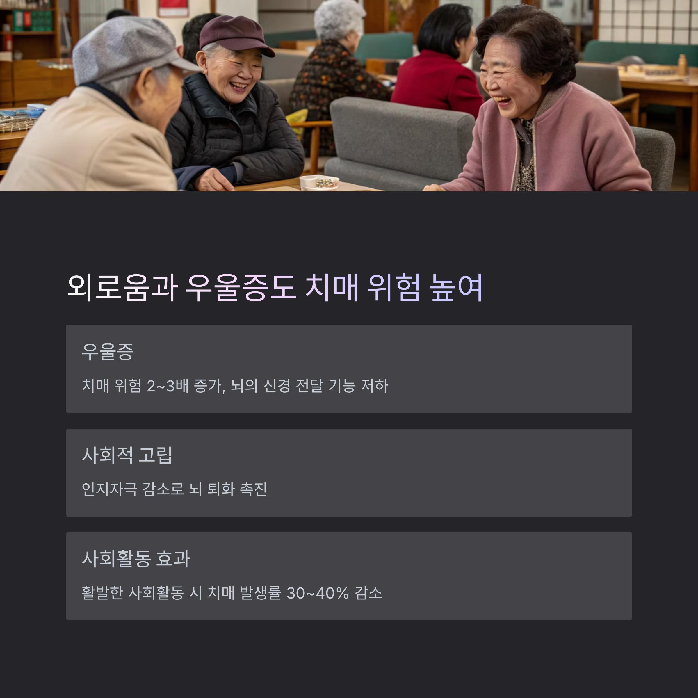 | 사회적 고립 | 높음 | 인지자극 감소로 퇴화 촉진 |