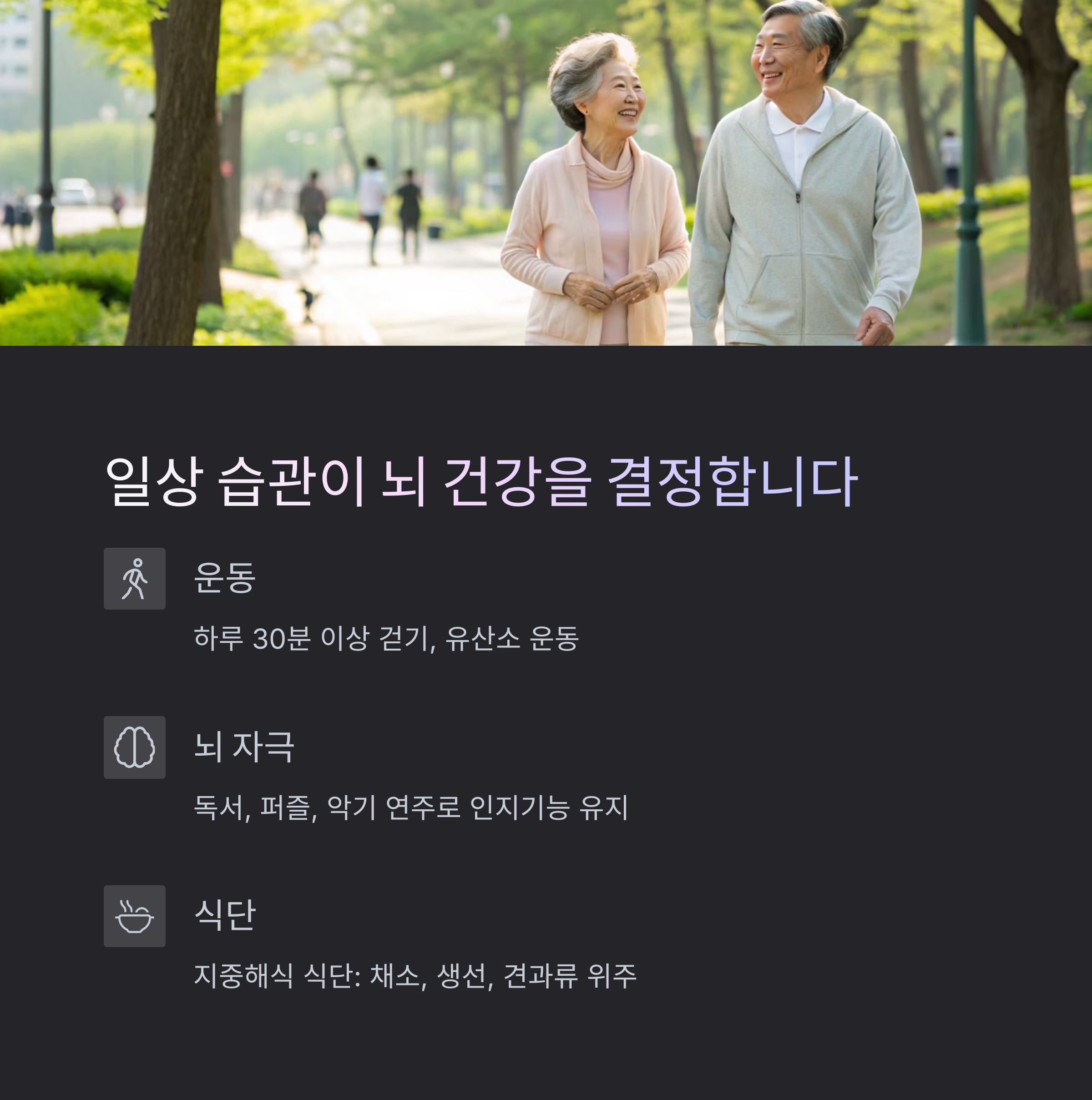 걷기, 유산소 운동, 뇌 자극 활동을 꾸준히 하는 것이 필수입니다.