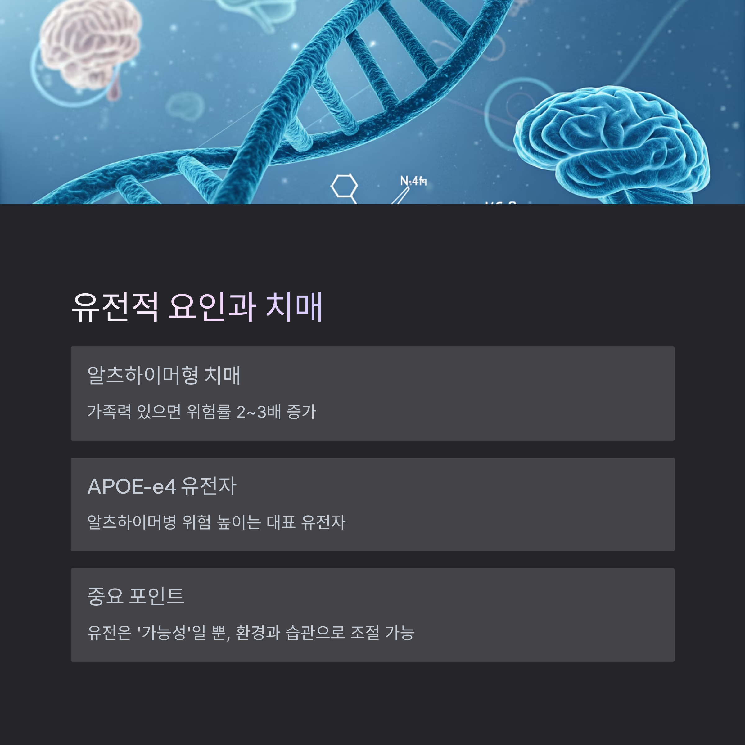핵심: 유전자는 ‘가능성’을 높일 뿐이며, 환경·습관으로 조절할 수 있습니다.