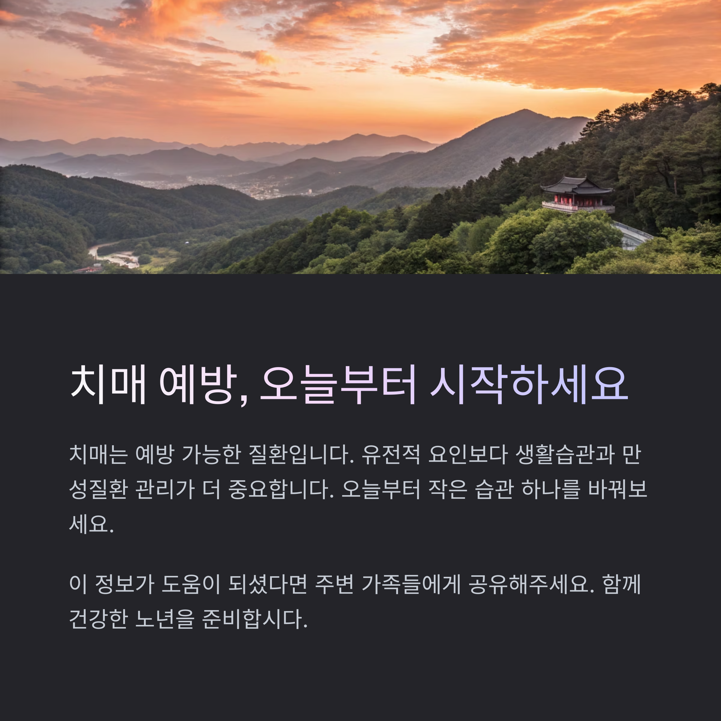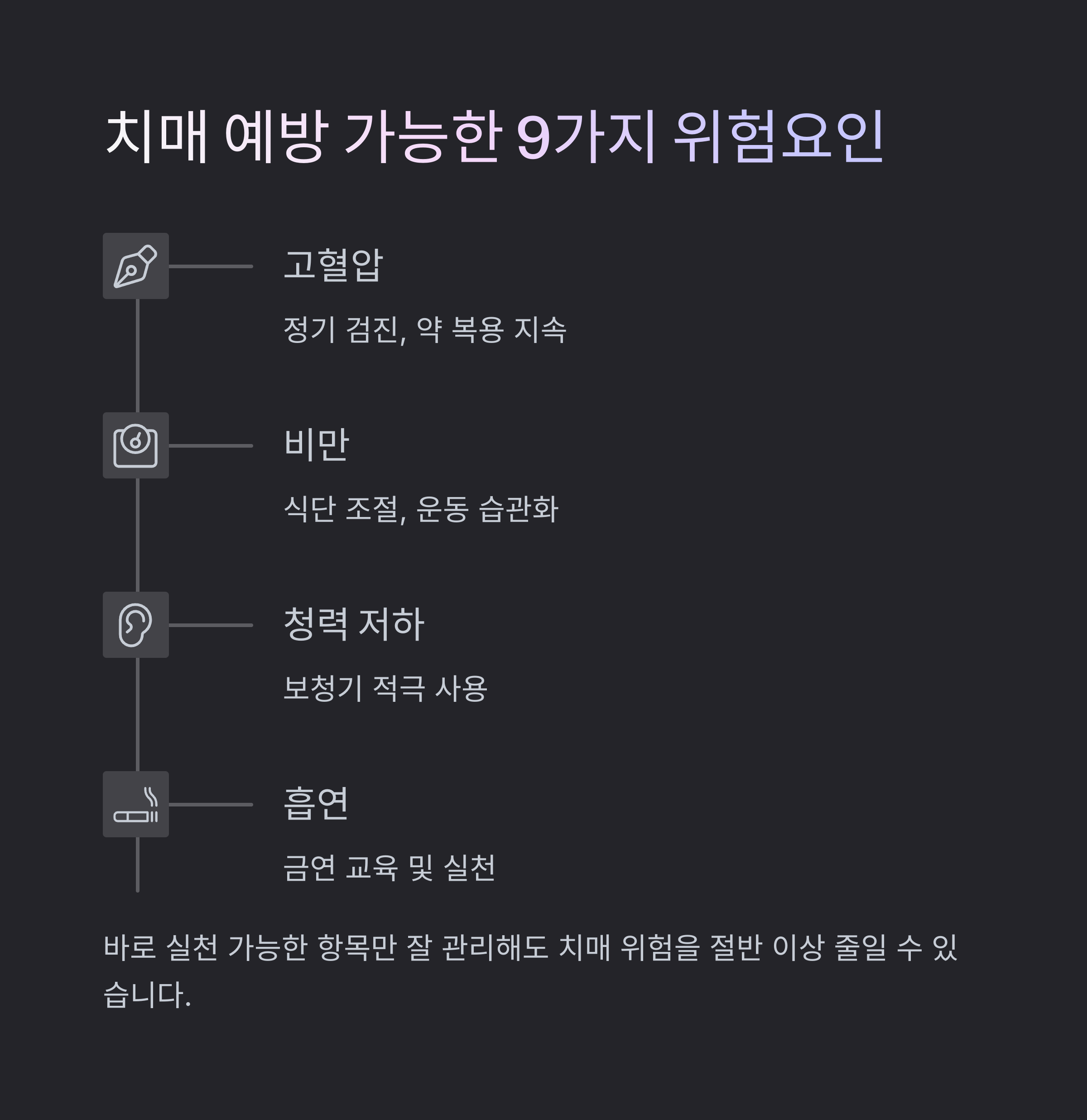 바로 실천 가능한 항목만 잘 관리해도 치매 위험을 절반 이상 줄일 수 있습니다.