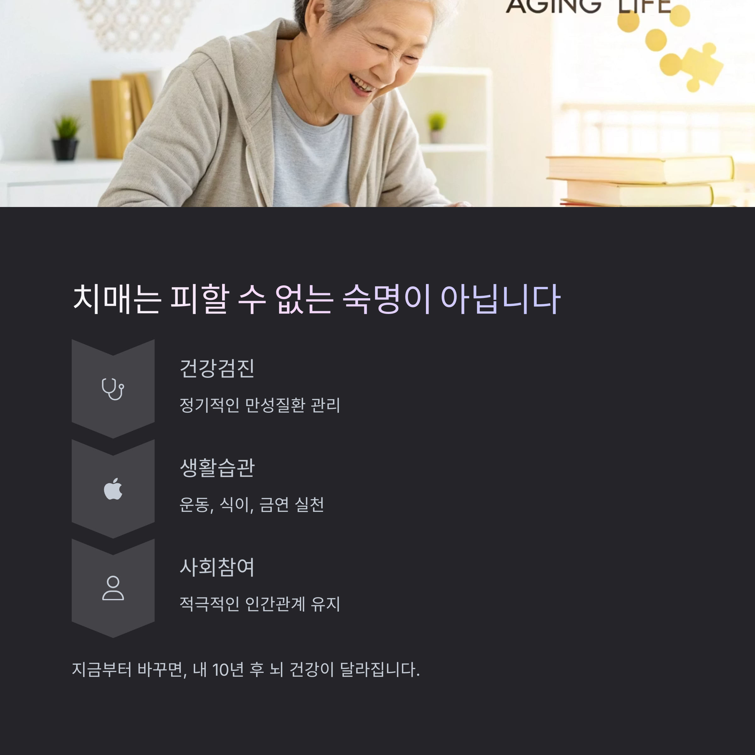 지금부터 바꾸면, 내 10년 후 뇌 건강이 달라집니다.
