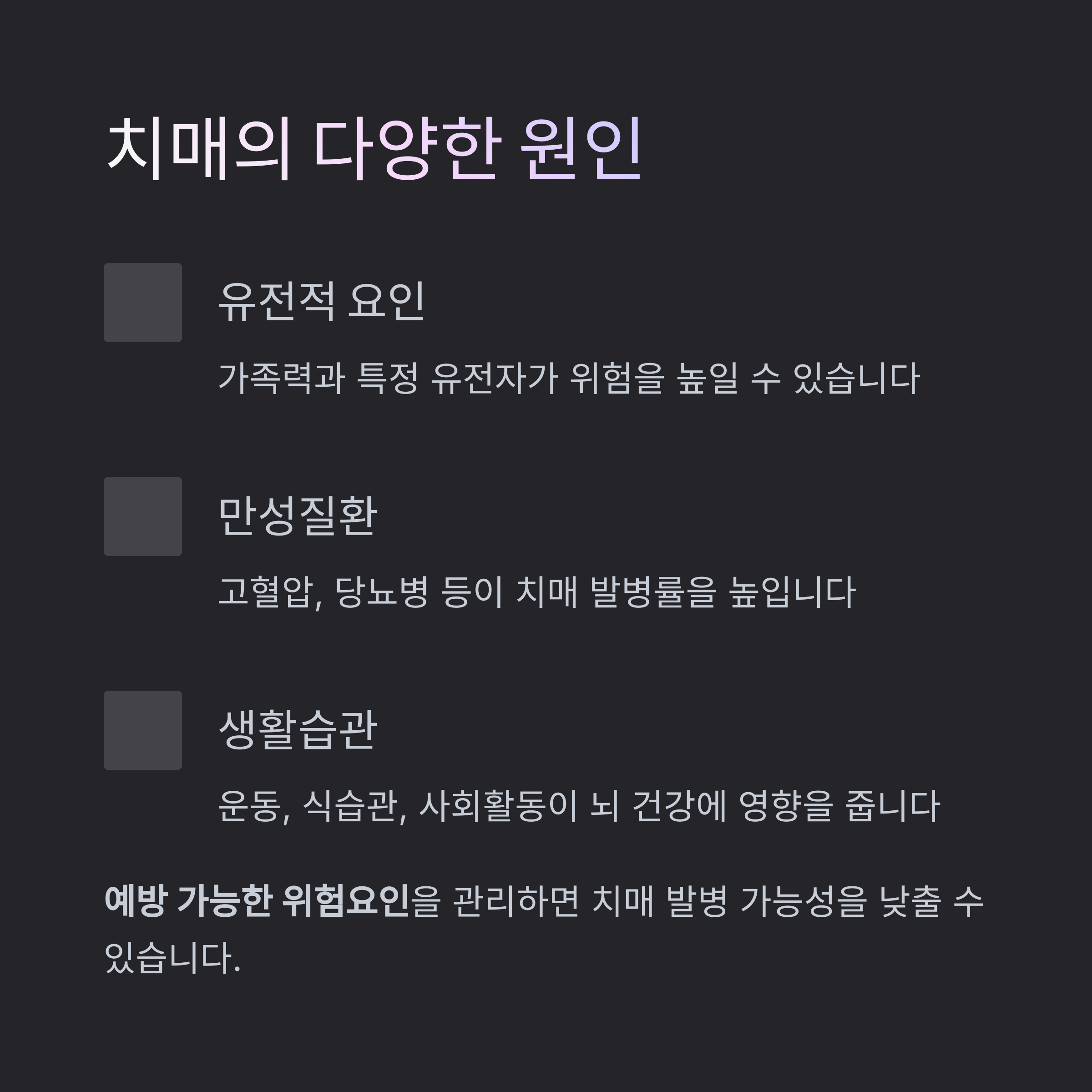 이번 글에서는 치매의 발생 원인과 주요 위험요인을 유전적·비유전적 요소로 나눠 명확히 설명드리겠습니다.