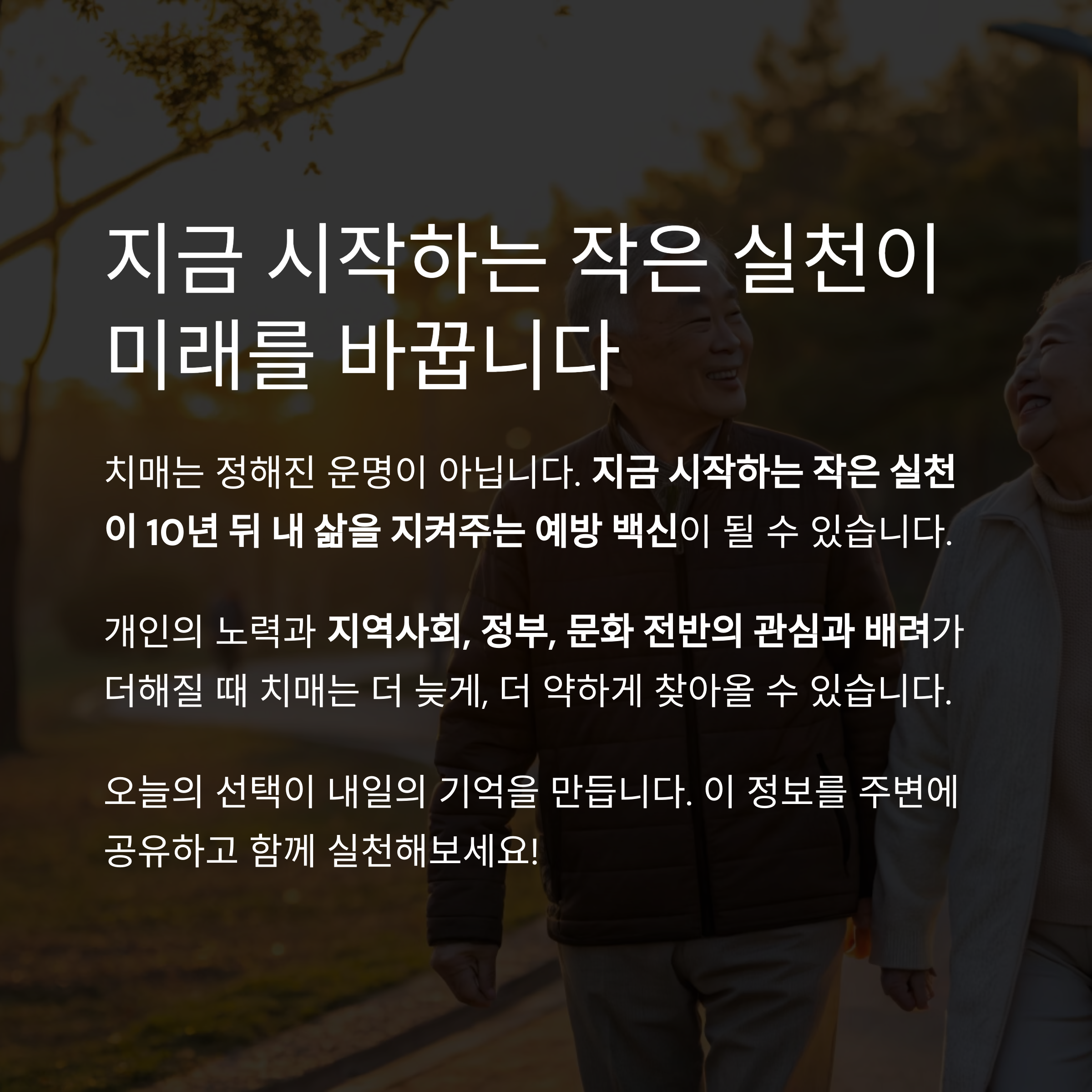 치매는 사회가 함께 예방하고, 함께 돌봐야 하는 공동의 과제입니다.