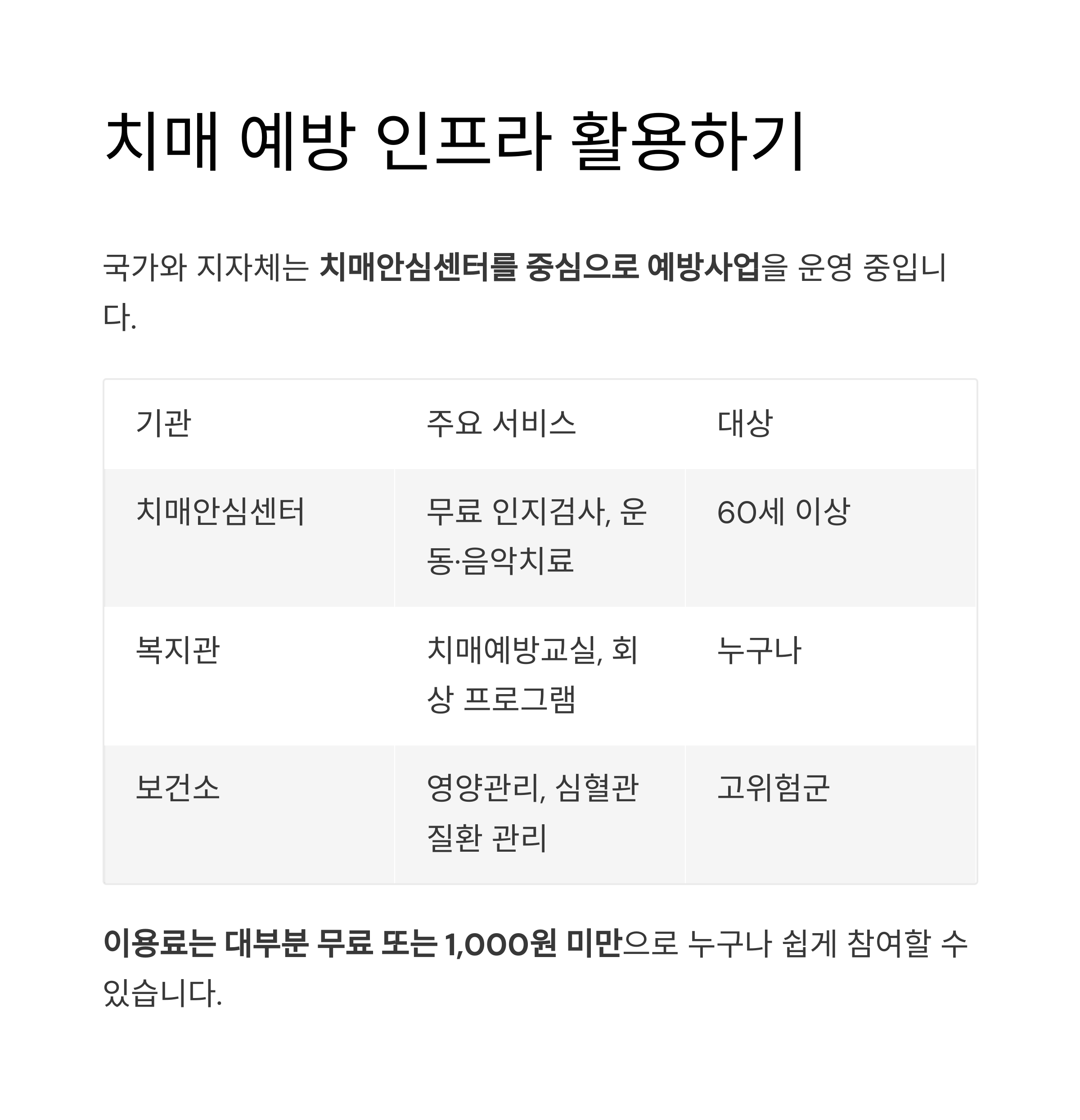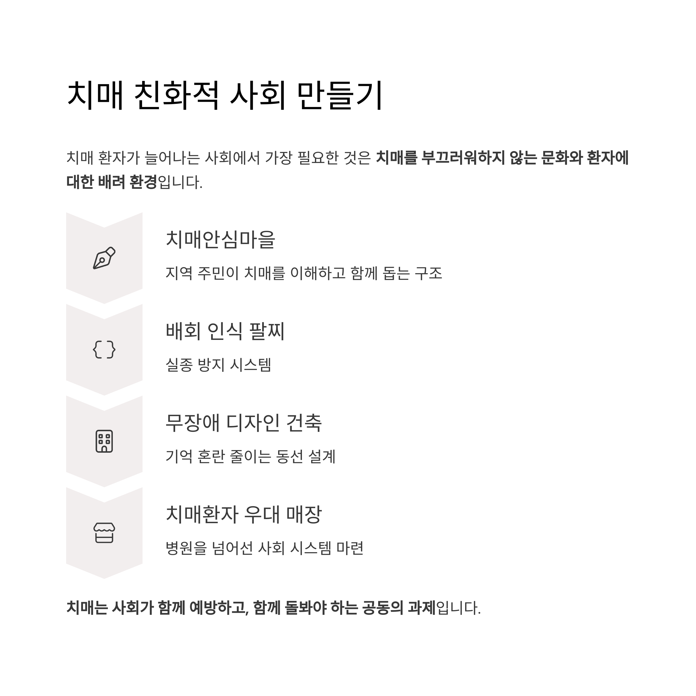 - 치매안심마을: 지역 주민이 치매를 이해하고 함께 돕는 구조