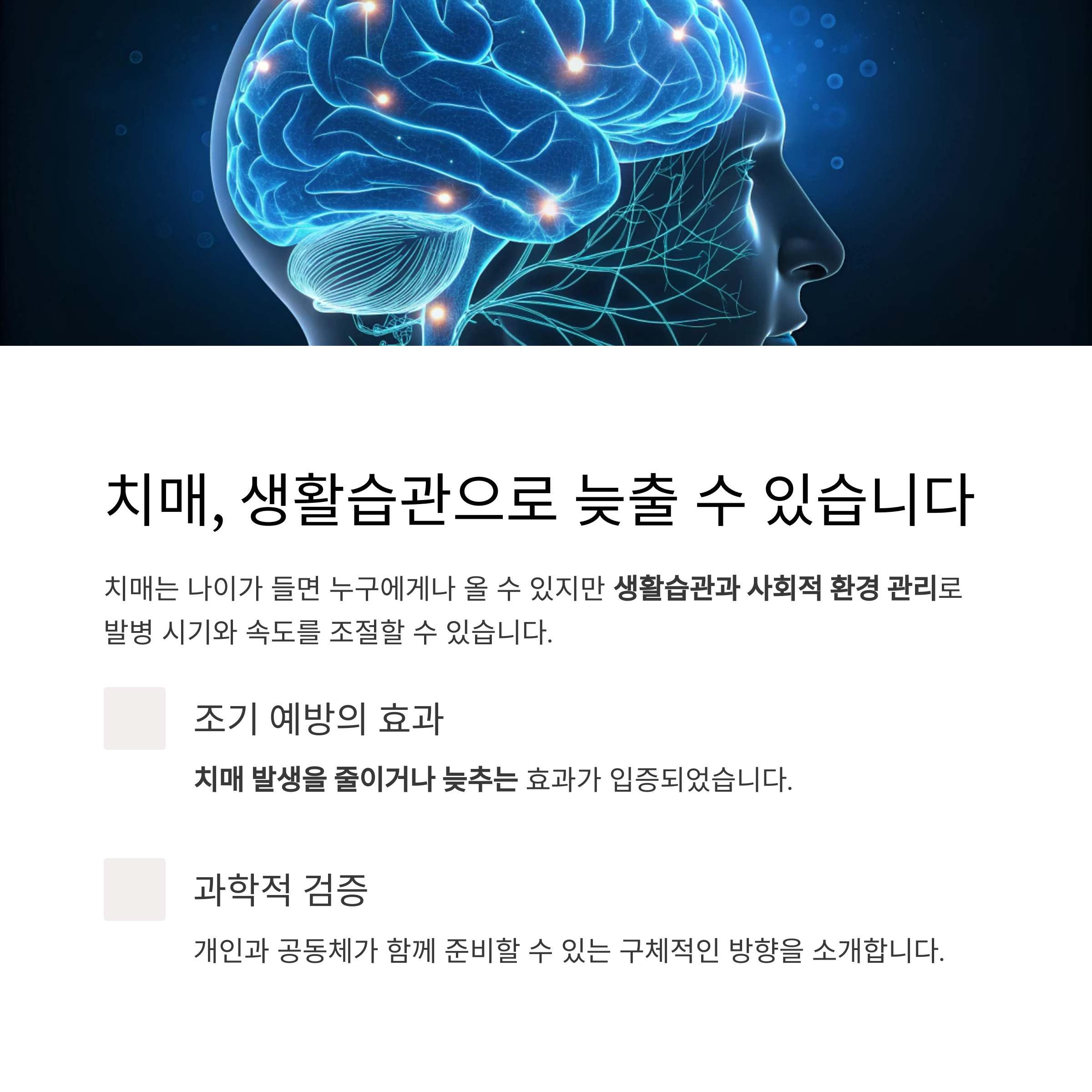 특히 조기 예방은 치매 발생 자체를 줄이거나, 늦추는 효과가 입증된 전략입니다.