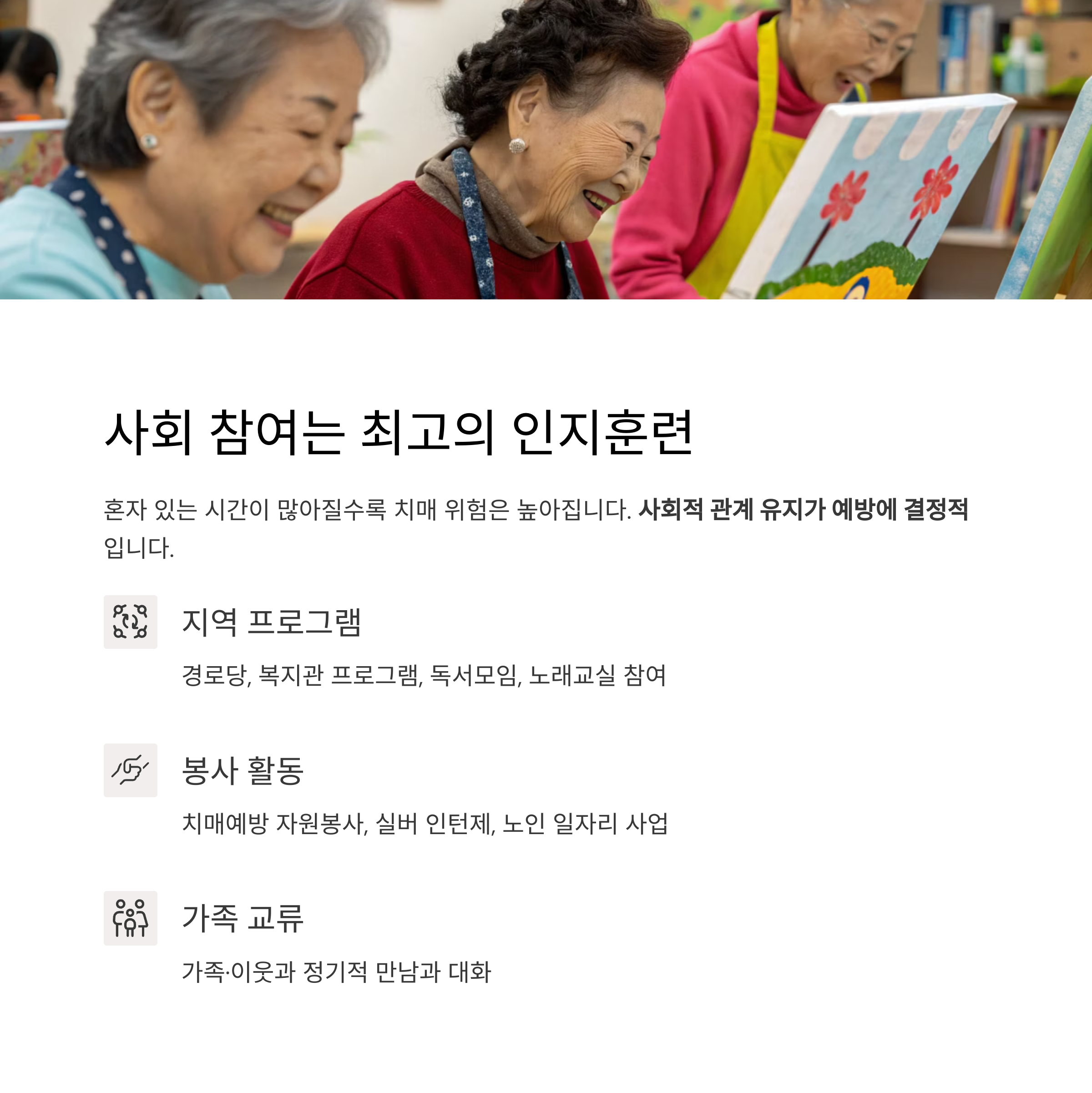 | 사회적 교류 | 고립 예방은 인지기능 보호 핵심 |