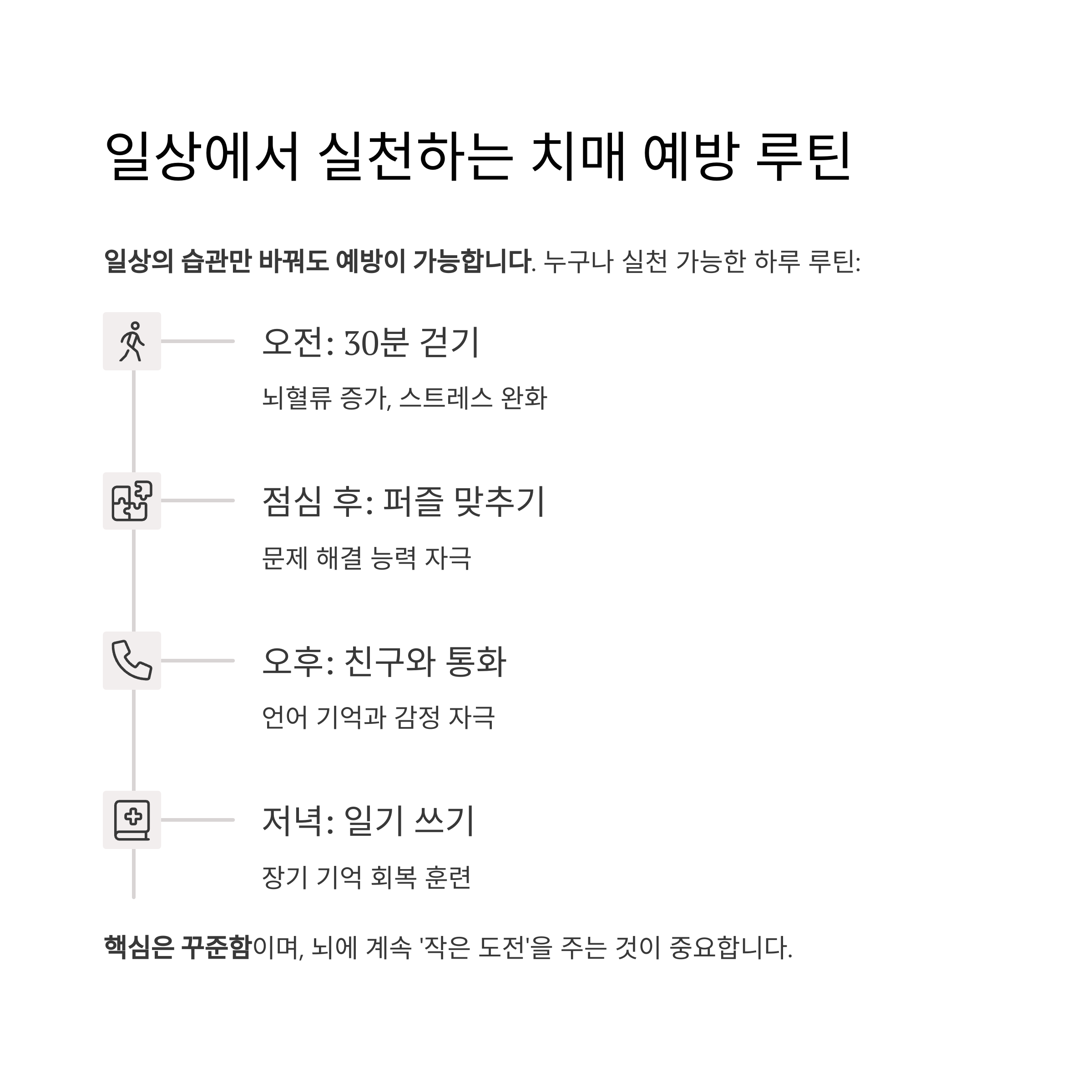 핵심은 꾸준함이며, 뇌에 계속 ‘작은 도전’을 주는 것이 중요합니다.