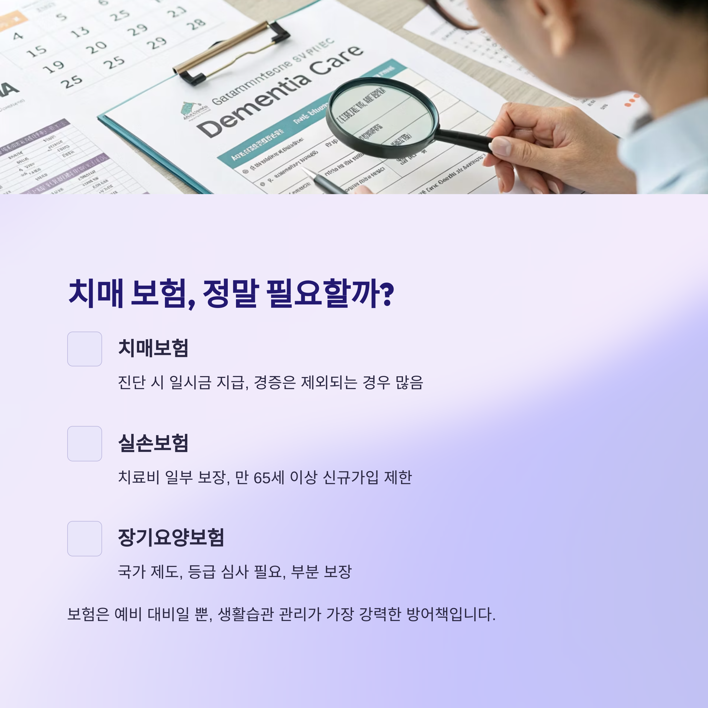 | 치매보험 | 진단 시 일시금 지급 | 경증은 제외되는 경우 많음 |