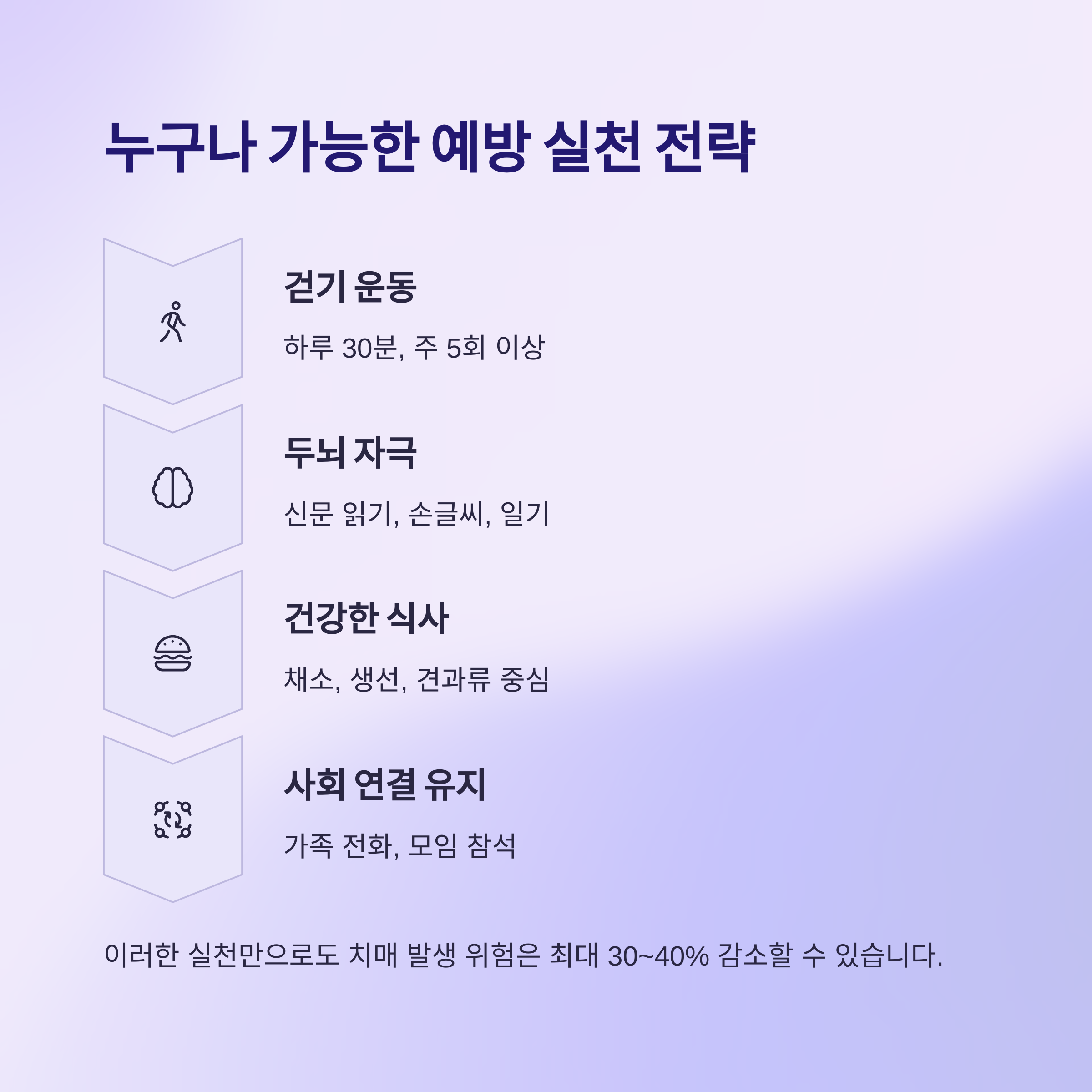 이러한 실천만으로도 치매 발생 위험은 최대 30~40% 감소할 수 있다는 보고도 있습니다.