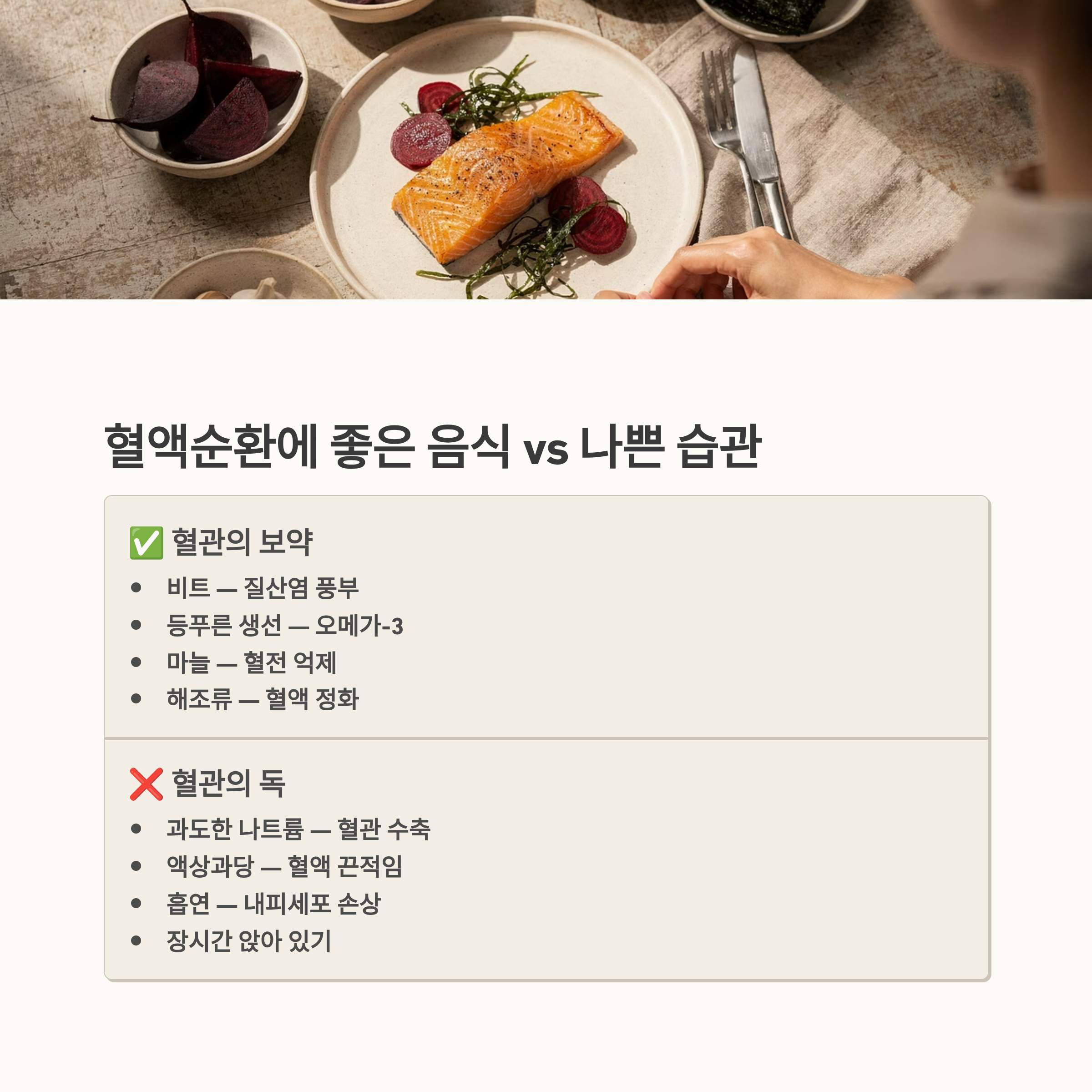 - 혈액순환의 보약: 비트(질산염 풍부), 등푸른 생선(오메가-3), 마늘(혈전 억제), 해조류(혈액 정화).