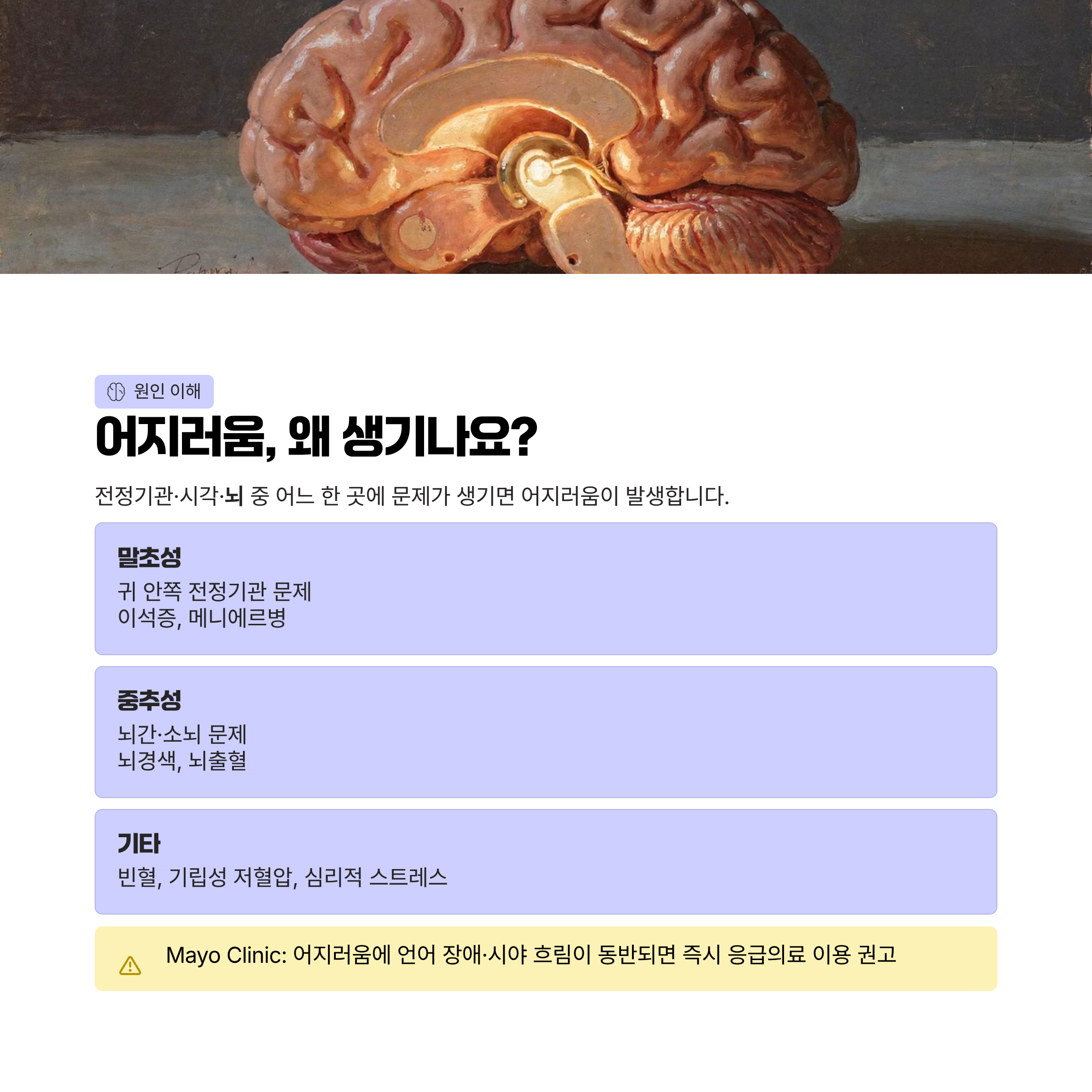 - 이석증: 특정 방향으로 고개를 돌릴 때만 짧고 강하게 어지럽습니다. 뇌 문제는 아니지만 일상에 큰 불편을 줍니다.