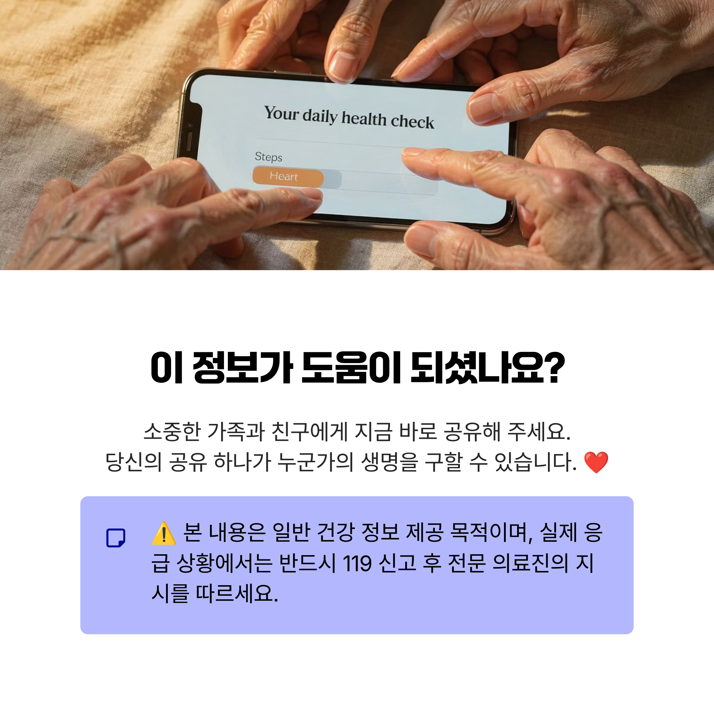 본 포스팅은 일반적인 건강 정보 제공을 목적으로 하며, 실제 응급 상황에서는 반드시 119 신고 후 전문 의료진의 지시를 따라야 합니다.