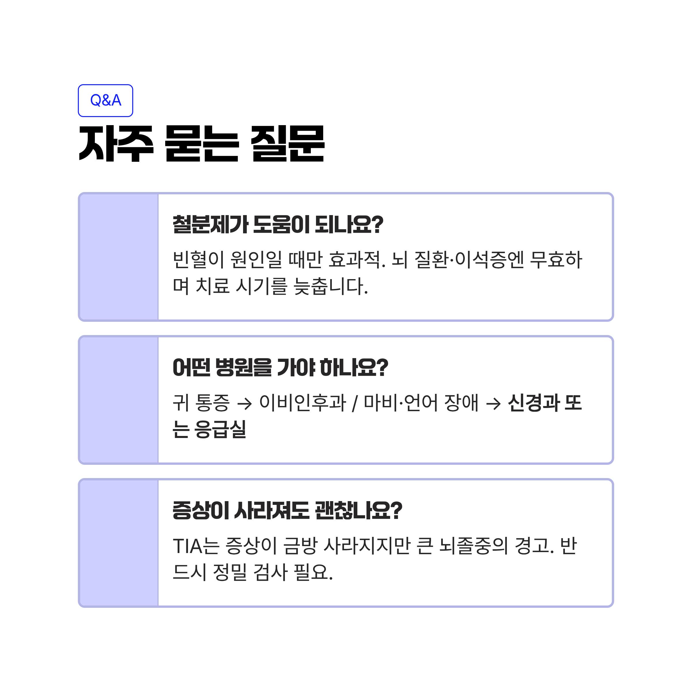 - 어지러움 외에 다른 **신경학적 증상(마비, 발음 이상 등)**이 반드시 하나 이상 나타납니다.