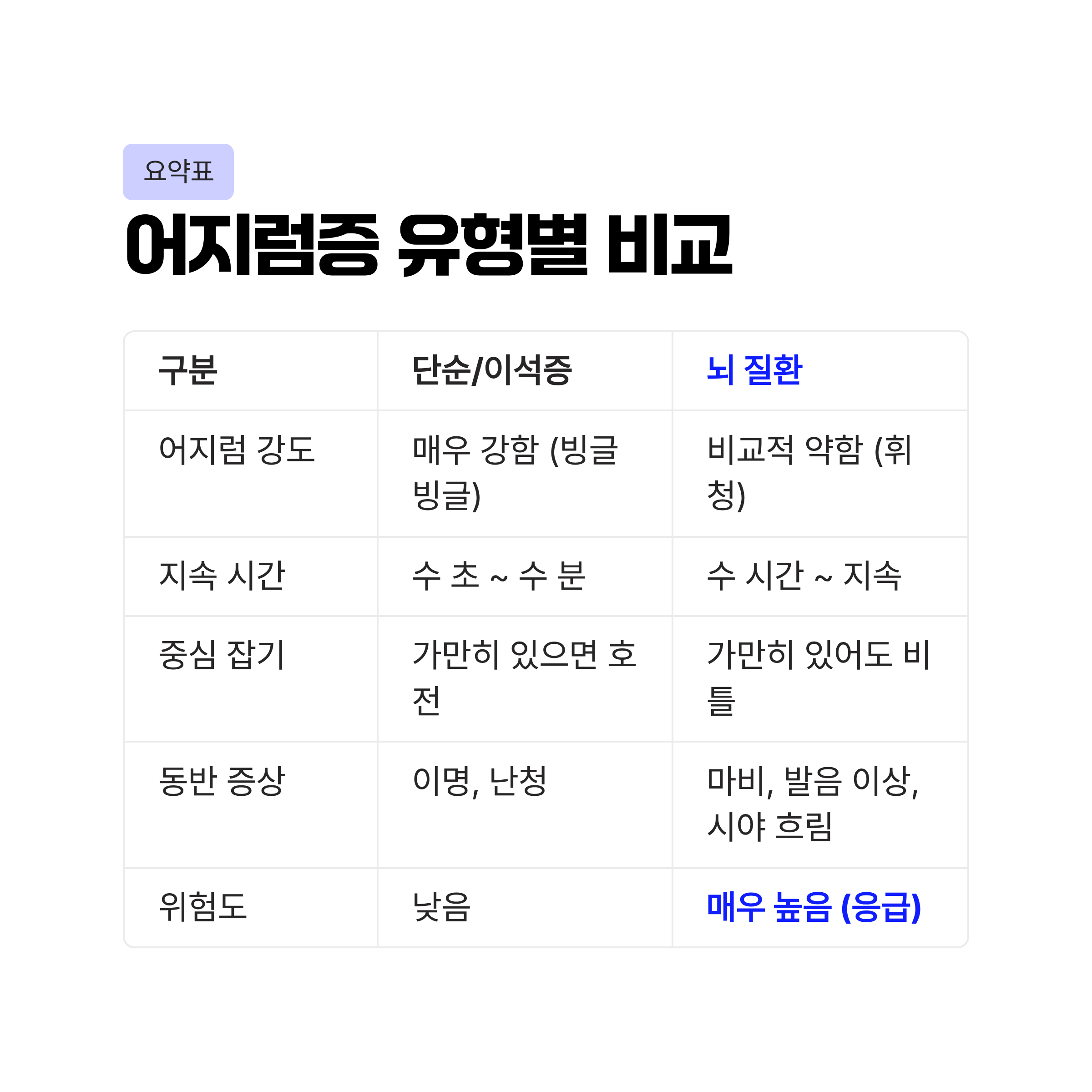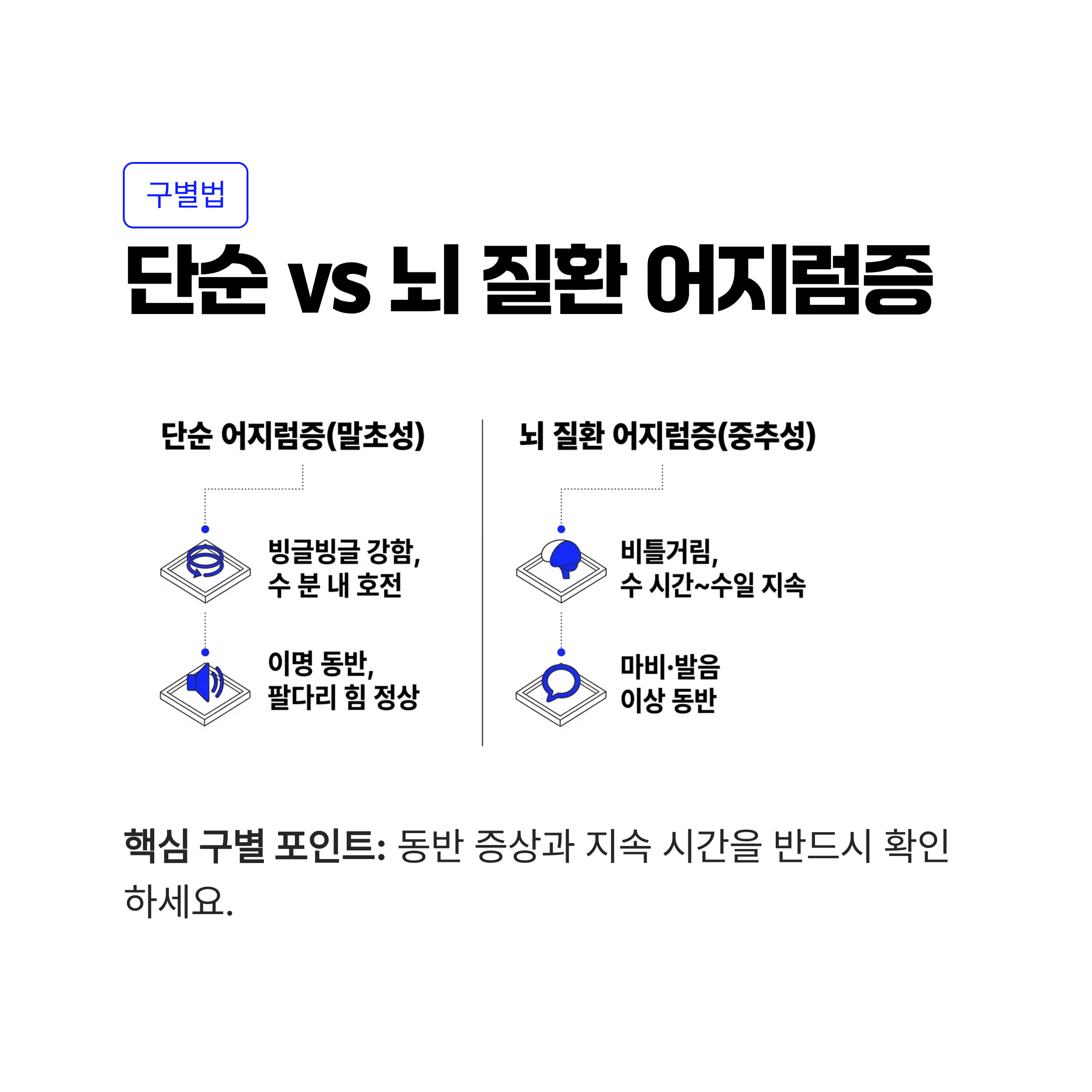 | 구분 | 단순/이석증 (말초성) | 뇌 질환 (중추성) |