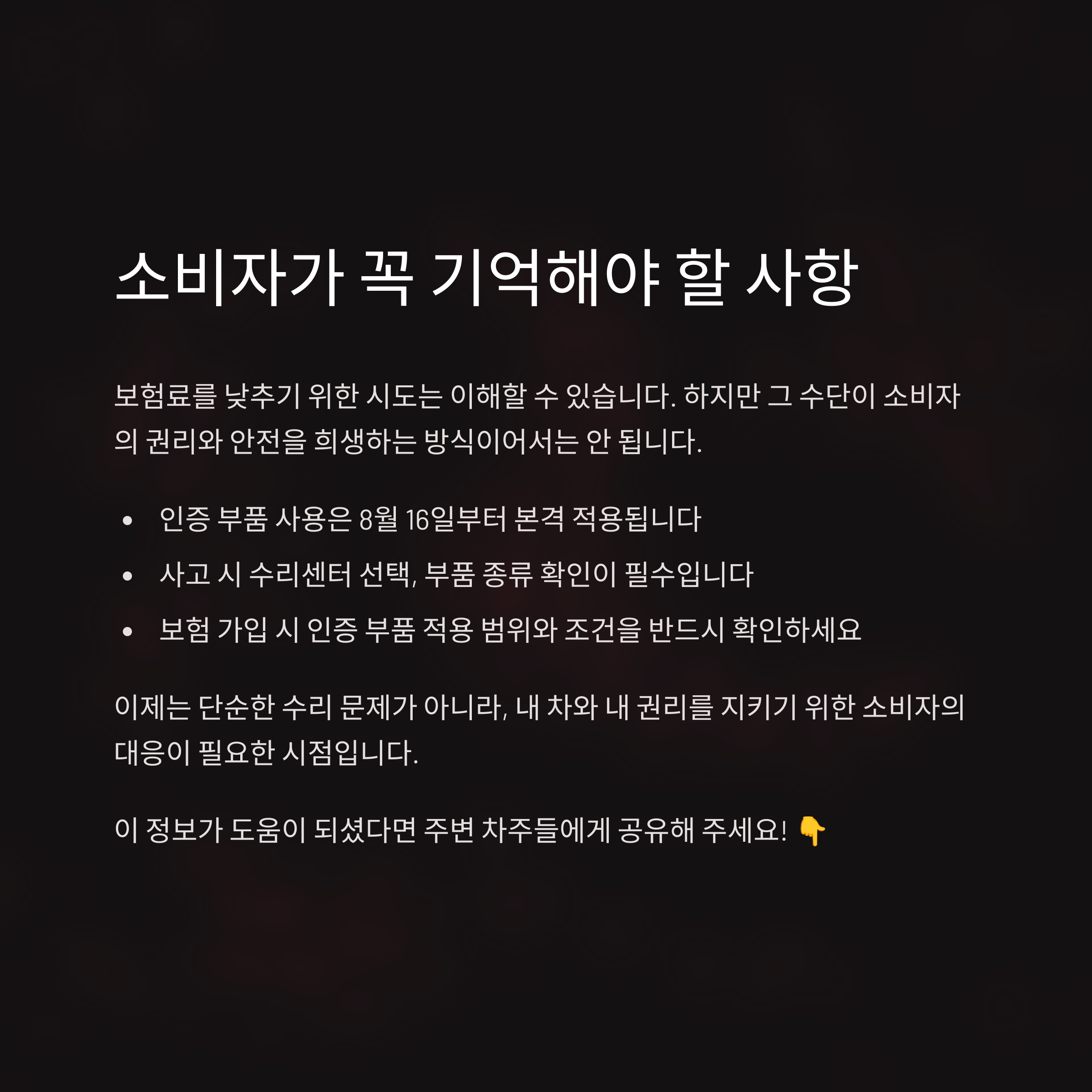 - 보험 가입 시 인증 부품 적용 범위와 조건 반드시 확인해야 함