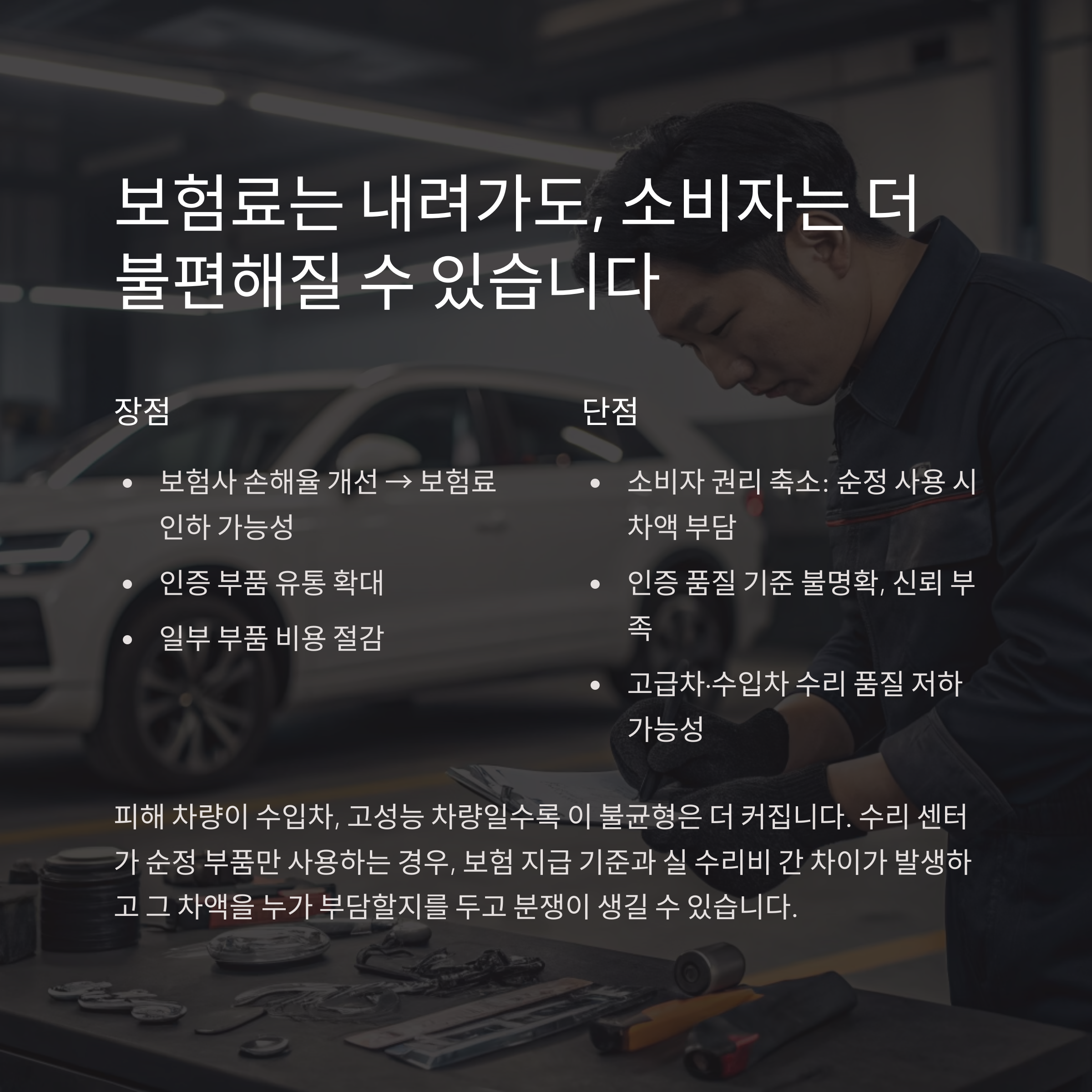 | 일부 부품 비용 절감 | 고급차·수입차 수리 품질 저하 가능성 |