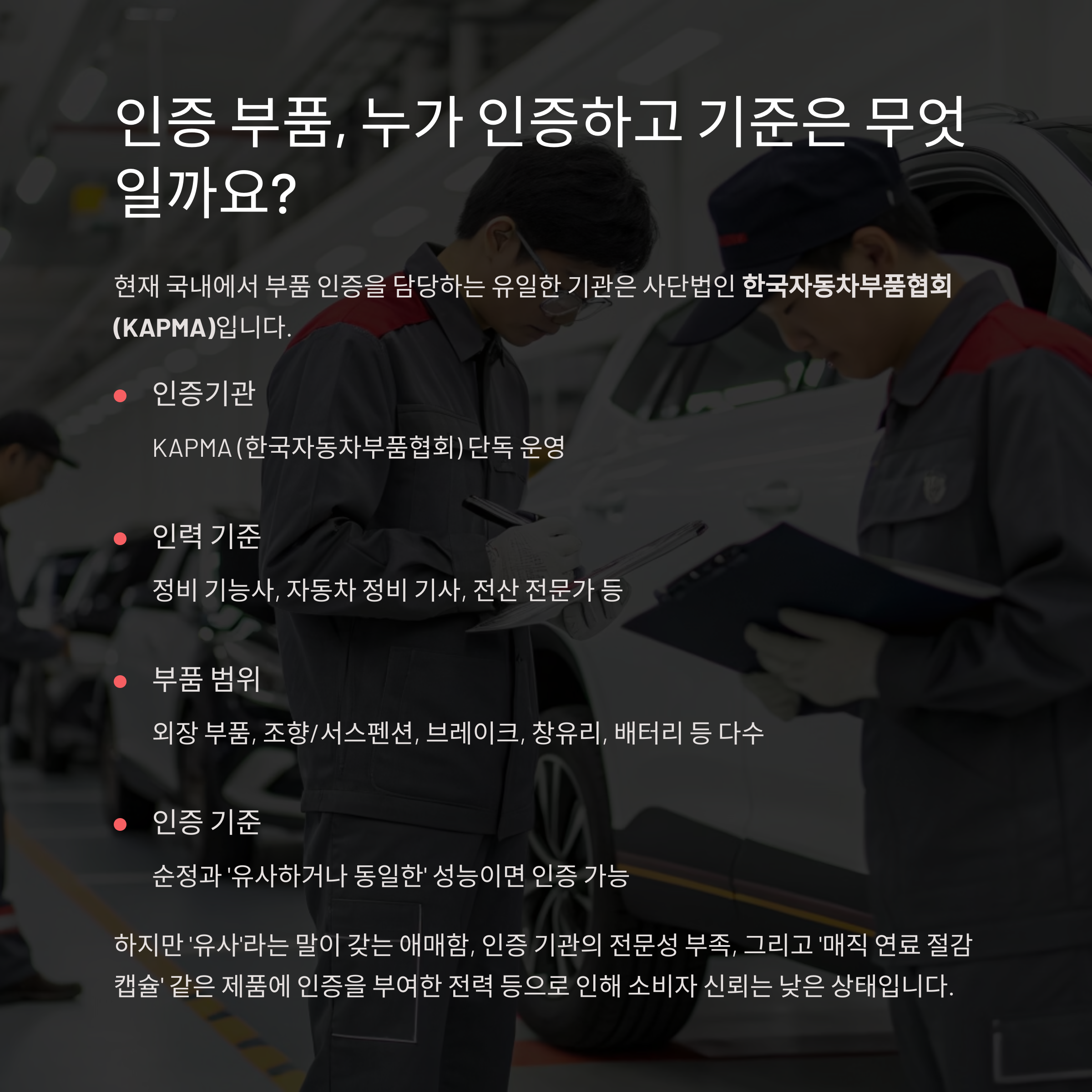 | 인증 부품 | 정부 기준을 충족한 대체 부품 | ‘KAPMA 인증’ 등 |