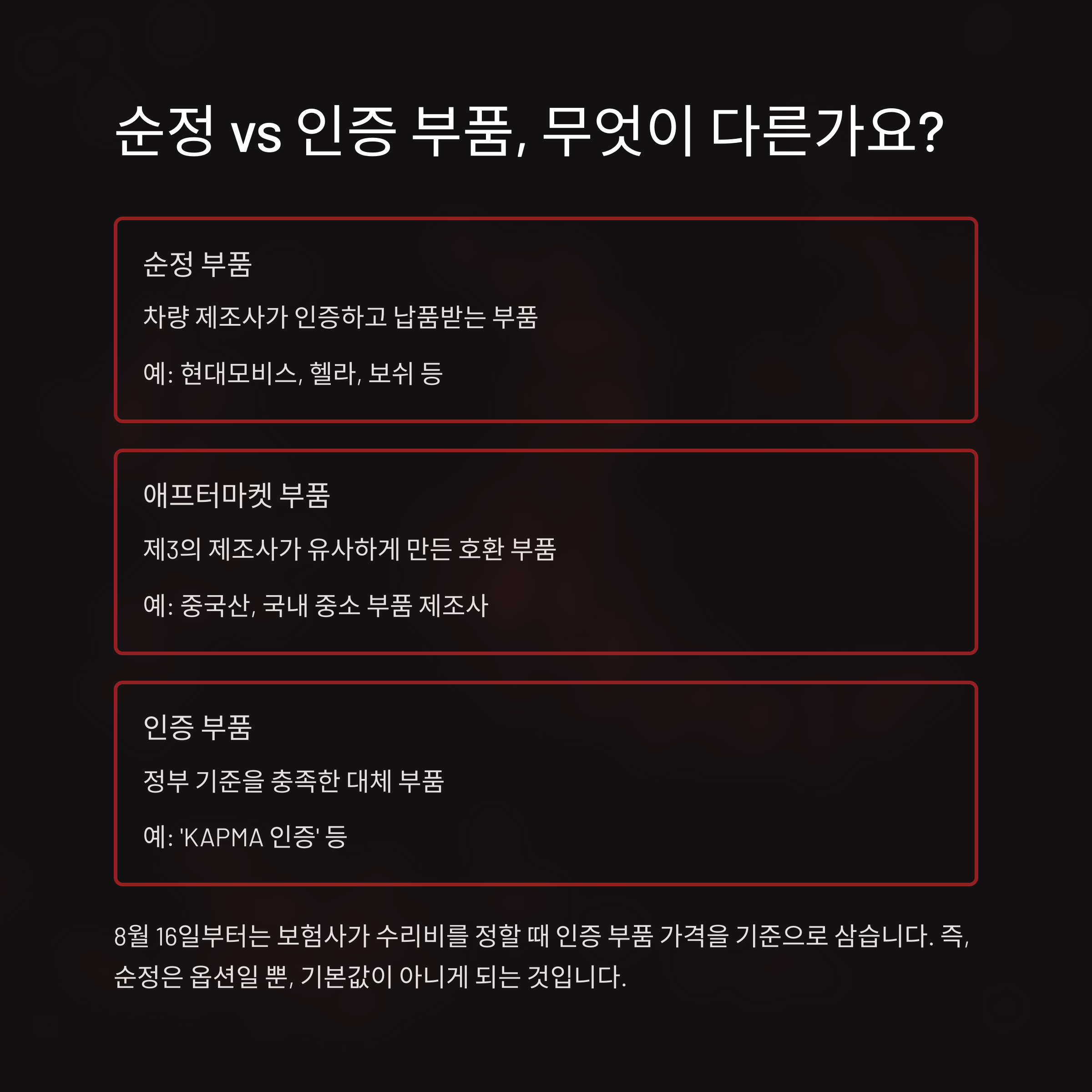 가장 큰 변화는 자동차 사고 시 보험 수리 기준이 순정(OEM) 부품이 아닌 '품질 인증 대체 부품'을 우선 적용하게 된다는 점입니다.