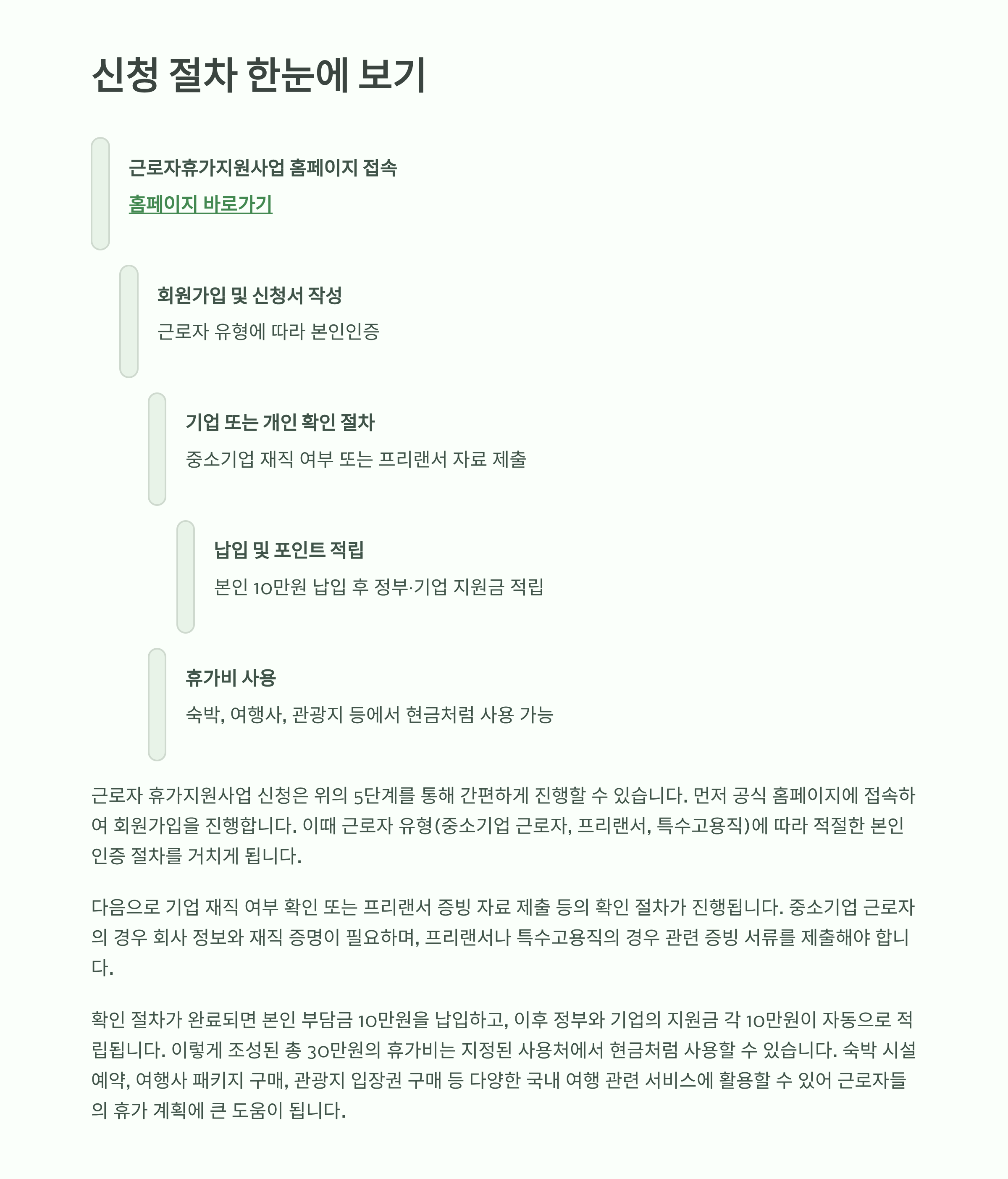 • 지원내용: 본인 10만원 납입 시 정부·기업이 각각 10만원씩 추가, 총 30만원 휴가비 조성
