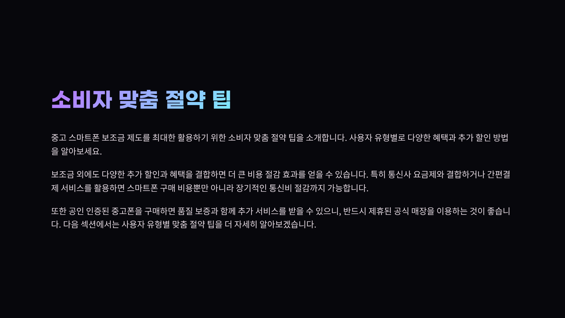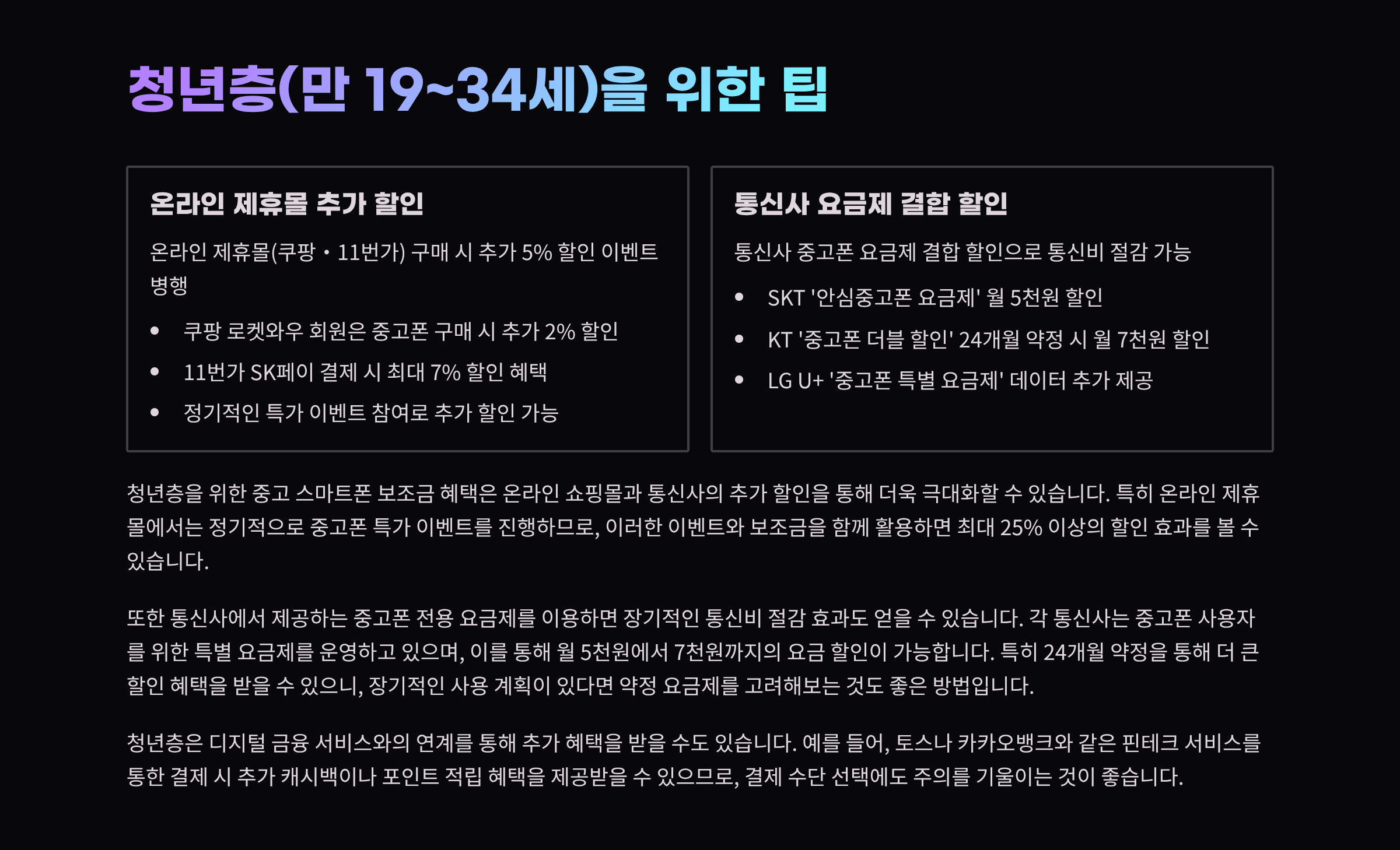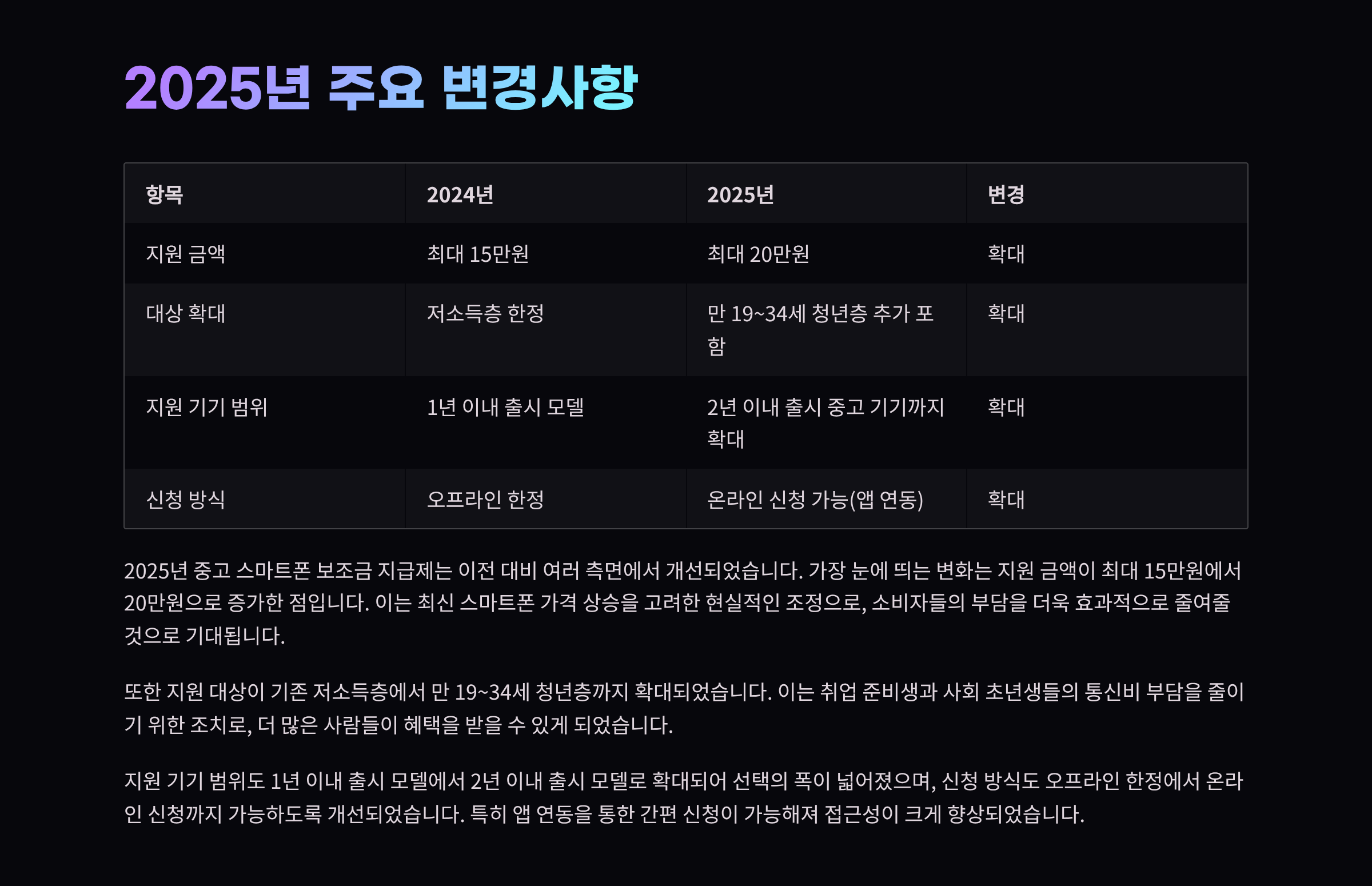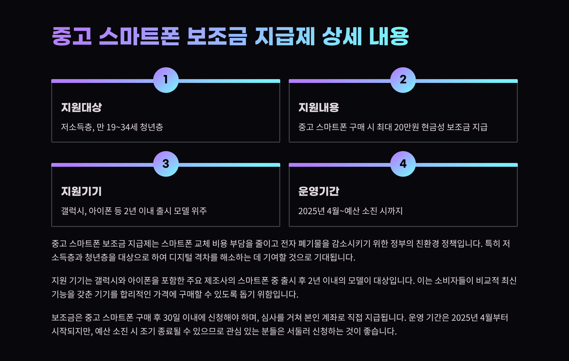 - 지원내용: 중고 스마트폰 구매 시 최대 20만원 현금성 보조금 지급