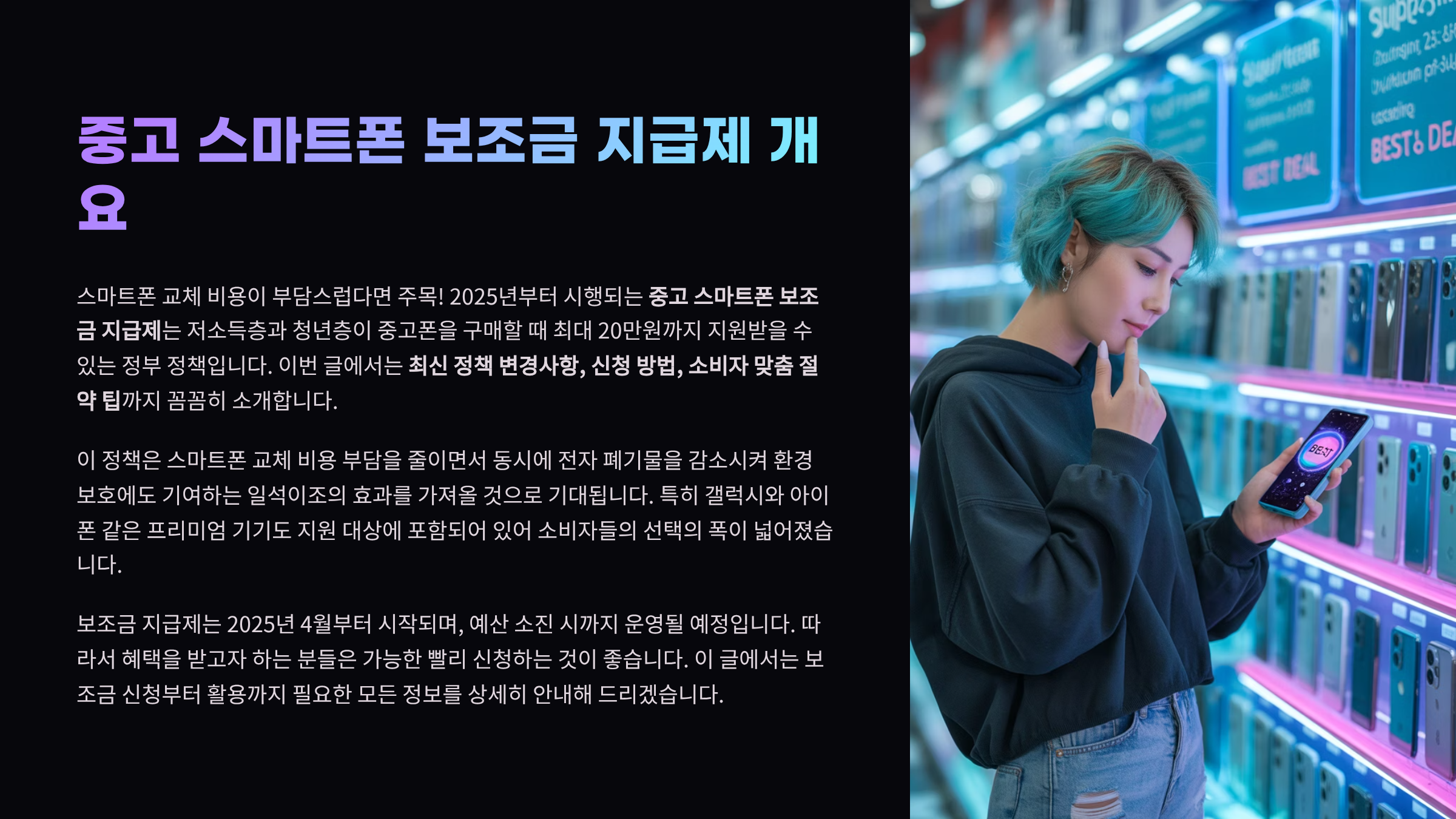 스마트폰 교체 비용이 부담스럽다면 주목! 2025년부터 시행되는 중고 스마트폰 보조금 지급제는 저소득층과 청년층이 중고폰을 구매할 때 최대 20만원까지 지원받을 수 있는 정부 정책입니다. 이번 글에서는 최신 정책 변경사항, 신청 방법, 소비자 맞춤 절약 팁까지 꼼꼼히 소개합니다.