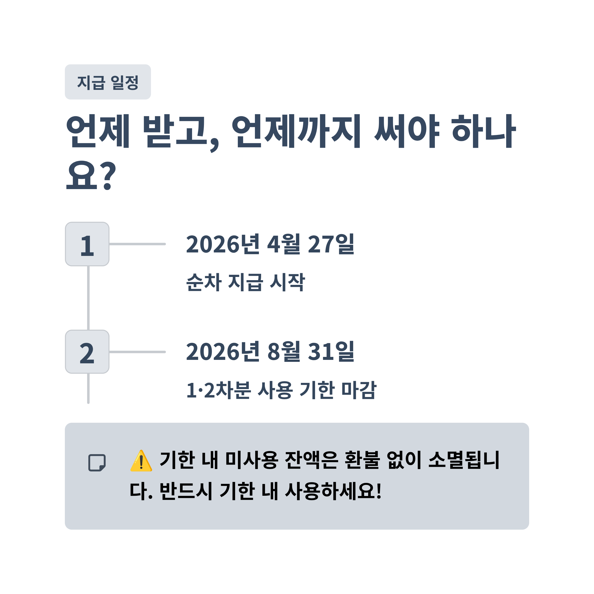 - 사용 기한: 1·2차분 모두 **2026년 8월 31일(월)**까지 사용 완료해야 합니다.