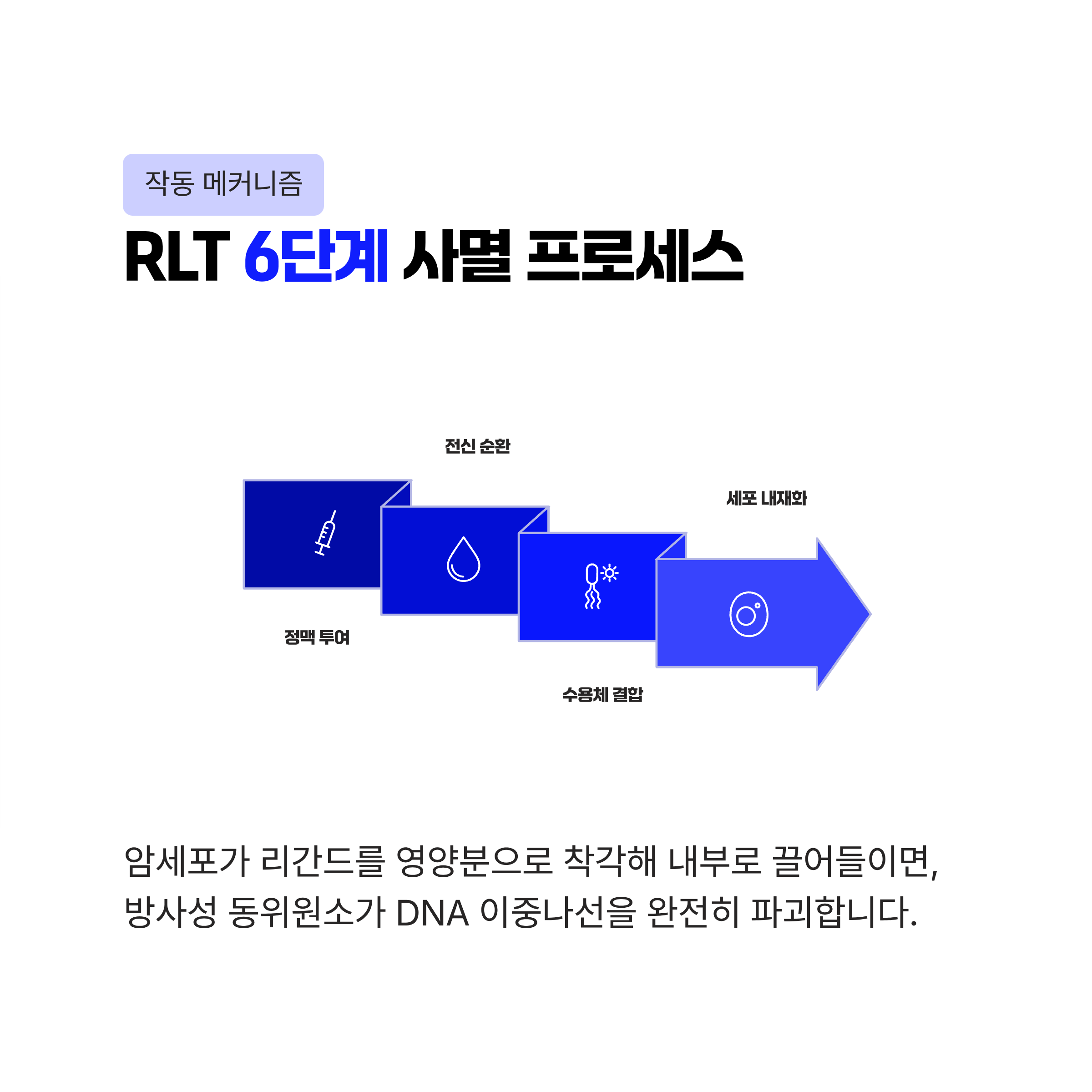 - 방사선 에너지 방출: 암세포 안으로 들어온 방사성 동위원소가 강력한 알파 또는 베타 입자를 방출합니다.