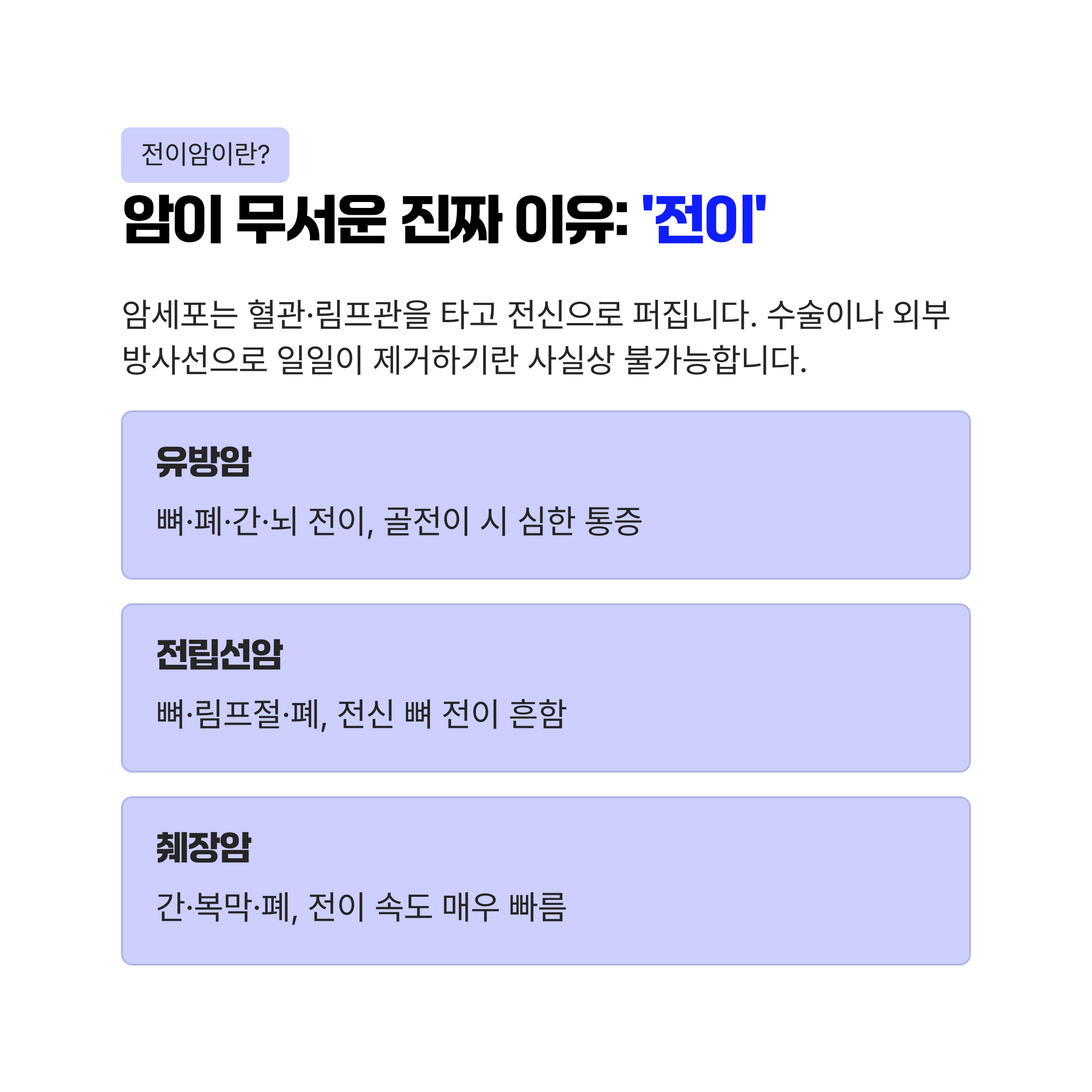 | 췌장암 | 간, 복막, 폐 | 전이 속도가 매우 빠름 |