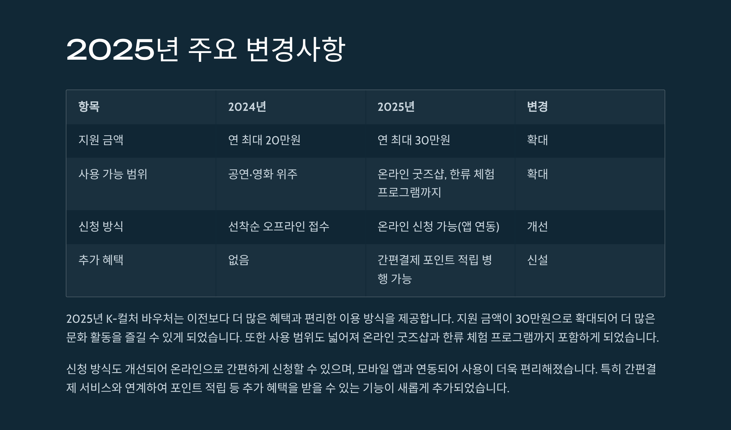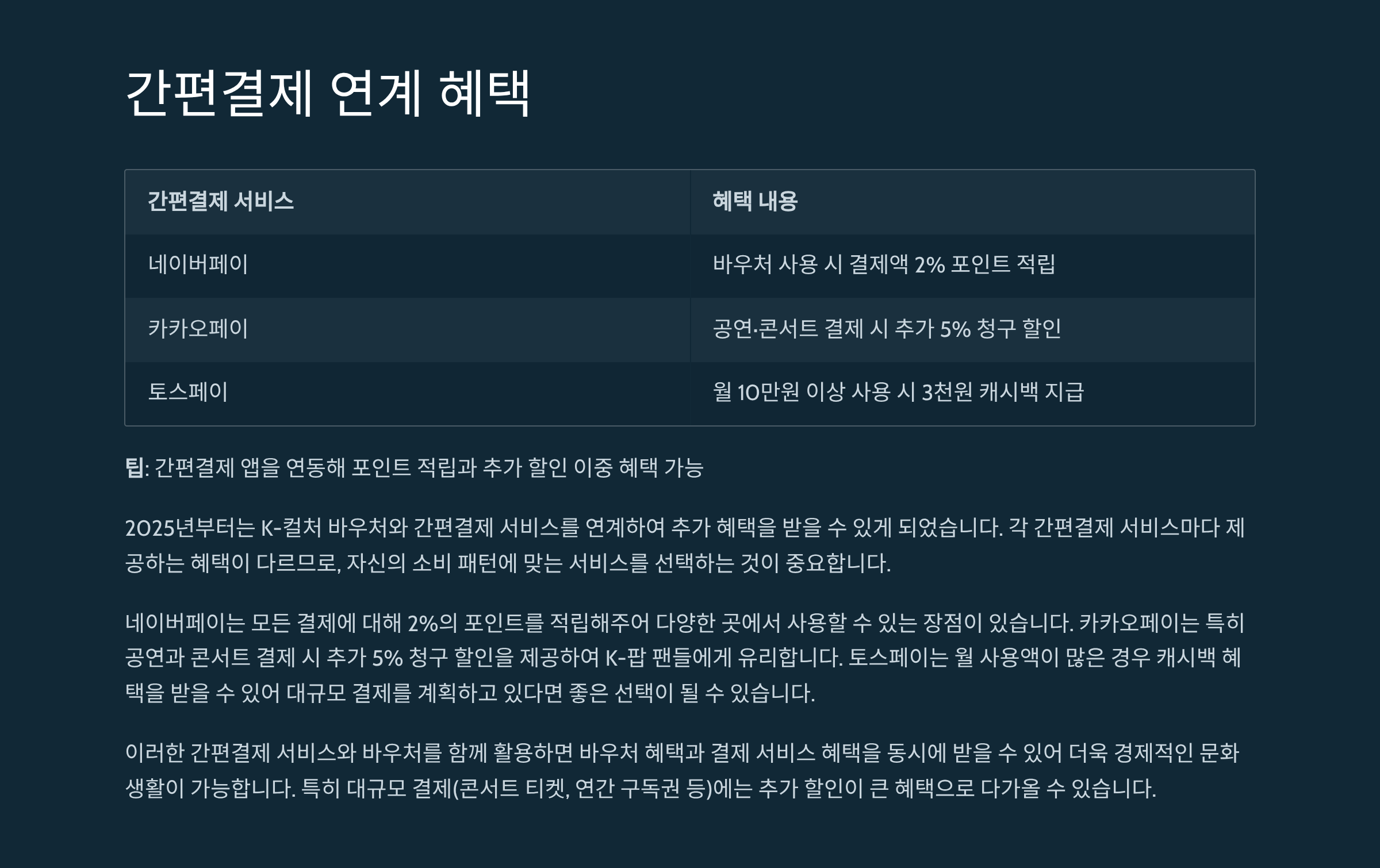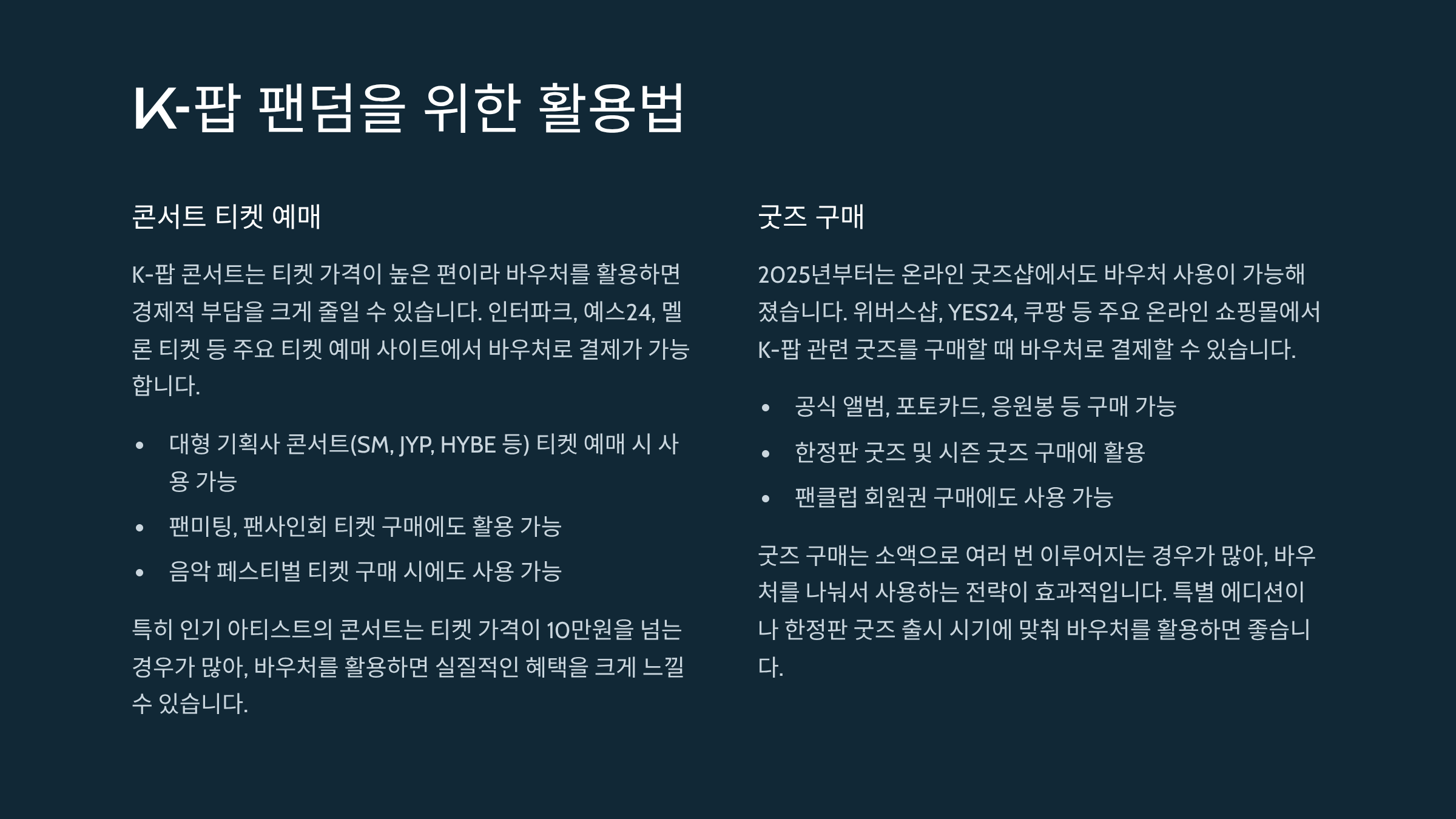 | 사용 가능 범위 | 공연·영화 위주 | 온라인 굿즈샵, 한류 체험 프로그램까지 확대 |
