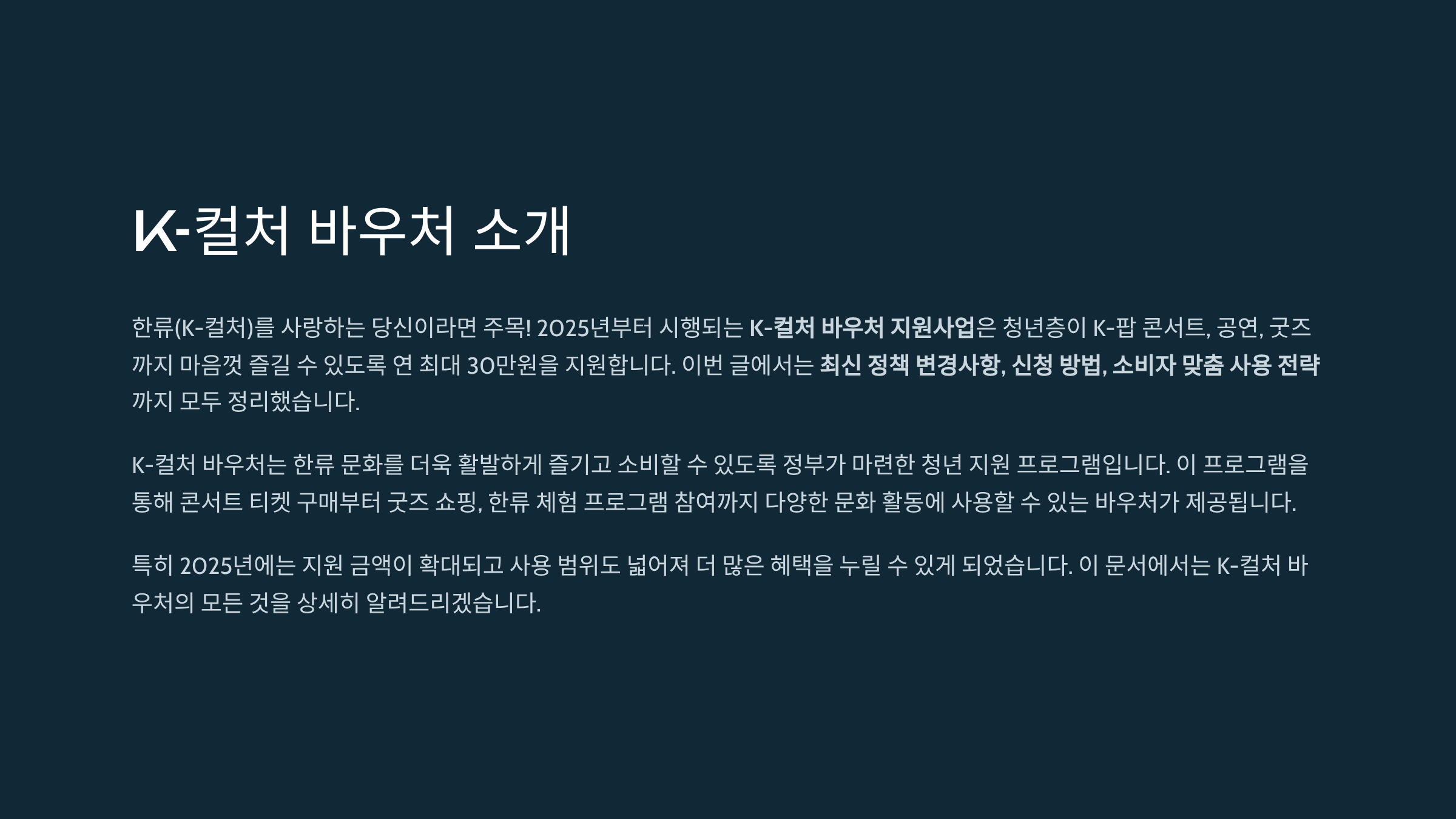 한류(K-컬처)를 사랑하는 당신이라면 주목! 2025년부터 시행되는 K-컬처 바우처 지원사업은 청년층이 K-팝 콘서트, 공연, 굿즈까지 마음껏 즐길 수 있도록 연 최대 30만원을 지원합니다. 이번 글에서는 최신 정책 변경사항, 신청 방법, 소비자 맞춤 사용 전략까지 모두 정리했습니다.
