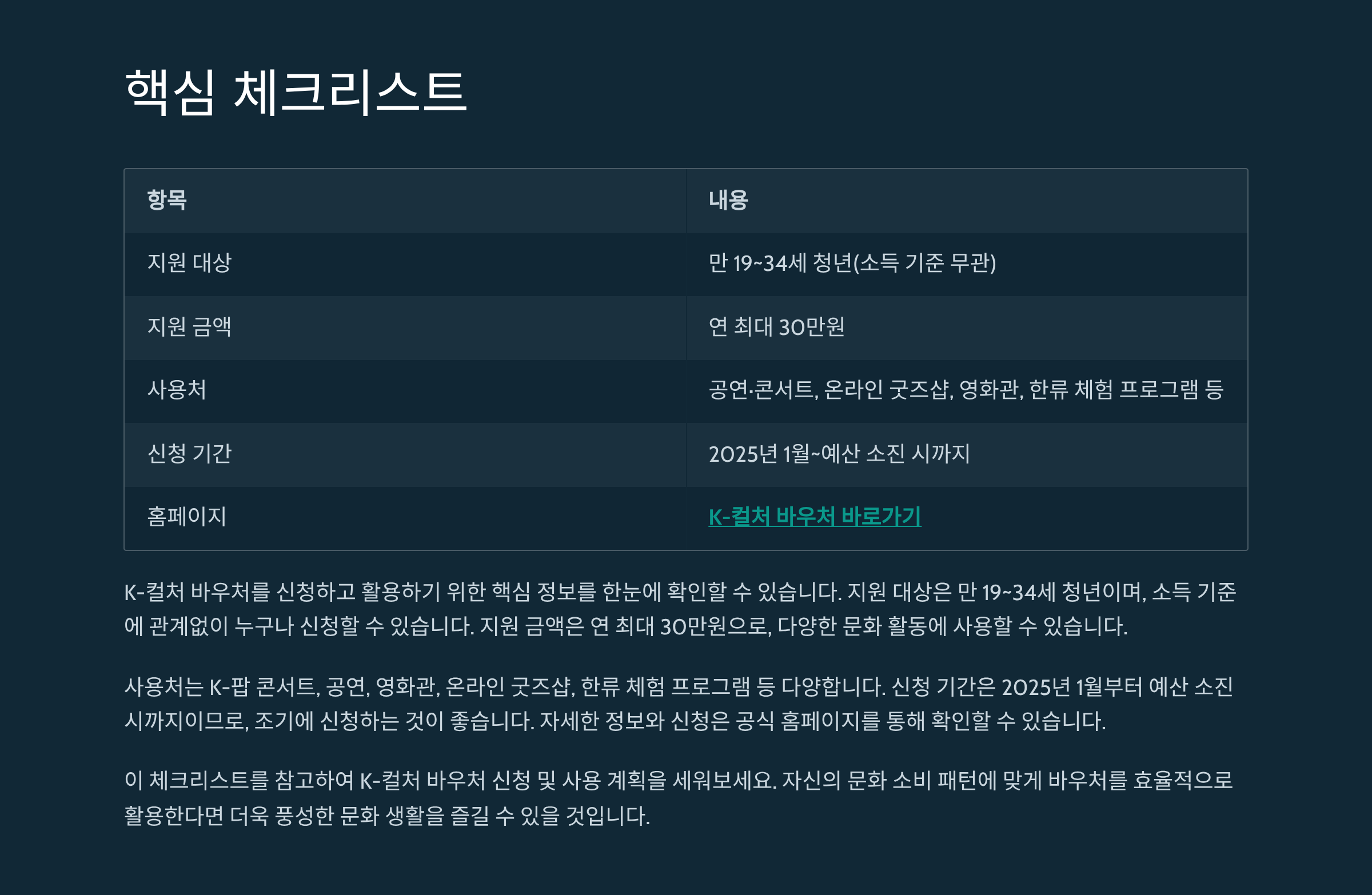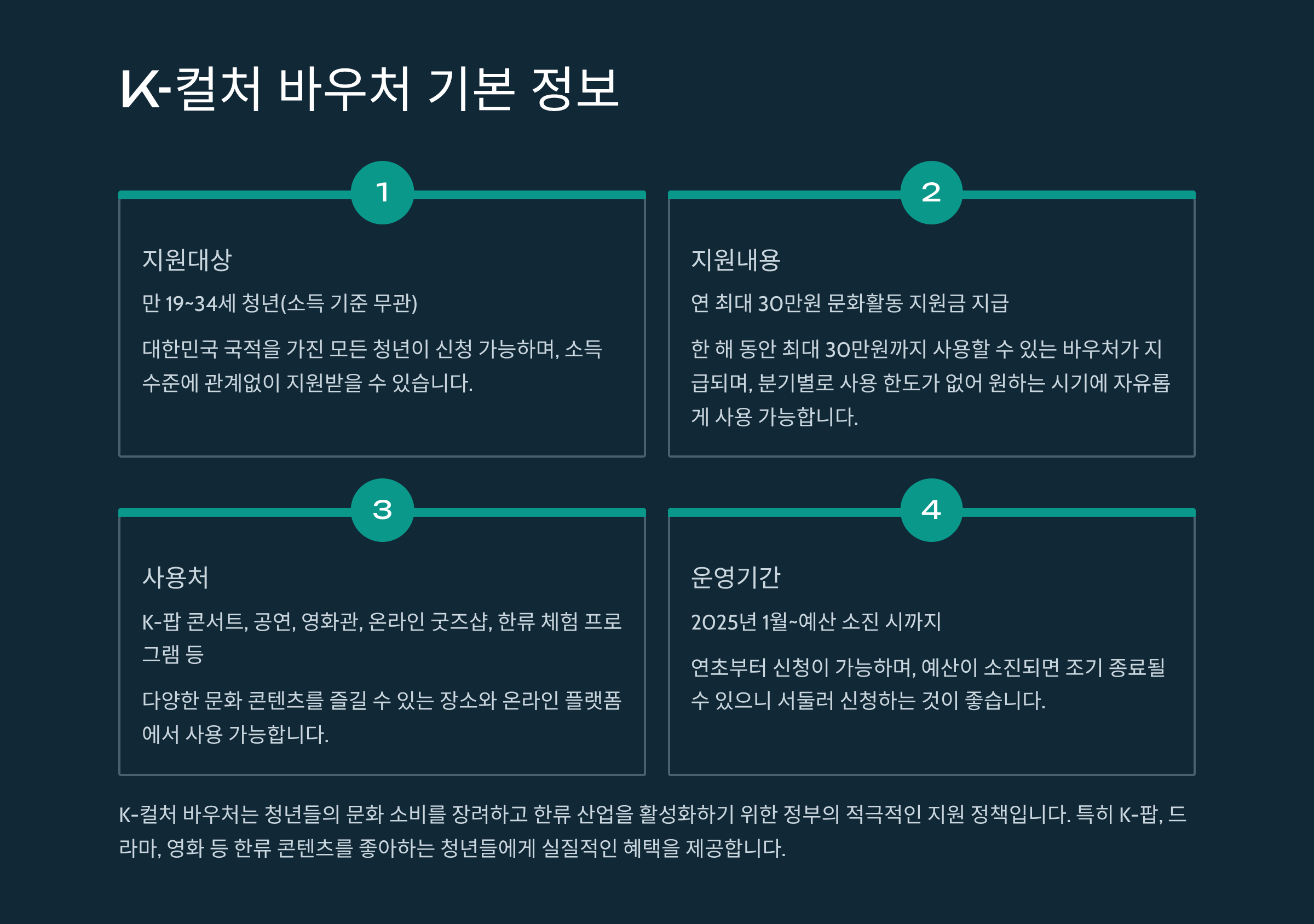 2025 K-컬처 바우처는 K-팝, 드라마, 영화, 한류 체험까지 모두 포함하는 청년 맞춤형 지원책입니다. 콘서트 티켓팅과 굿즈 구매 계획이 있다면 놓치지 말고 바로 신청하세요. 조기 소진 가능성이 높습니다.